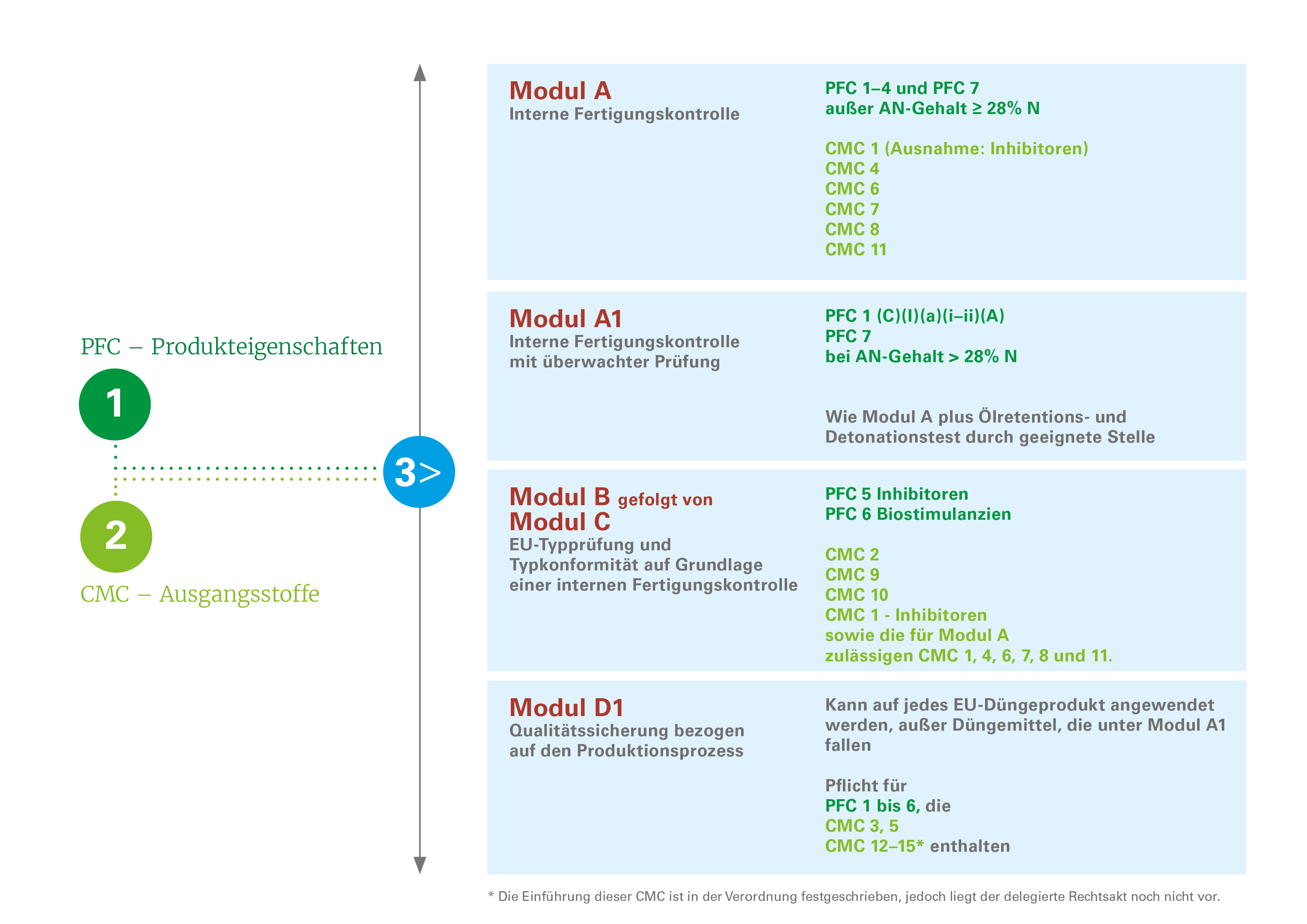 Für die Konformitätsbewertung muss ein EU-Düngeprodukt in Abhängigkeit von den Produkteigenschaften und den eingesetzten Ausgangsstoffen eines von vier Bewertungsmodulen durchlaufen. Die Funktion eines Produkts ist das erste Kriterium zur Auswahl des Konformitätsbewertungsmoduls. Die grundlegenden Anforderungen für die jeweilige Produktfunktionskategorie (PFC) sind im Anhang I der Verordnung (EU) 2019/1009 festgelegt. Das zweite Kriterium zur Auswahl des Konformitätsbewertungsmoduls ist die Zusammensetzung eines Produkts. Im Anhang II der Verordnung finden sich die grundlegenden Anforderungen für die jeweiligen Komponentenmaterialkategorien (CMC).