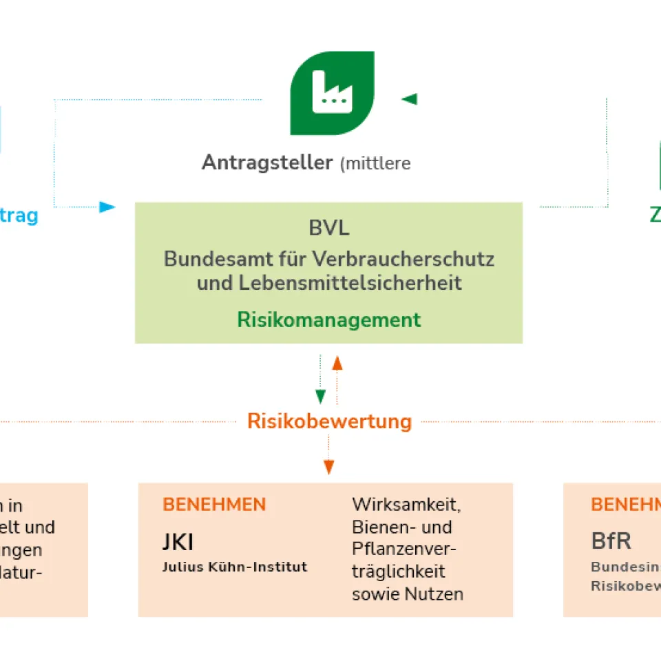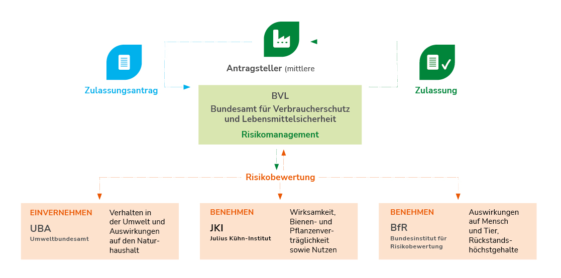Für die Zulassung von Pflanzenschutzmitteln in Deutschland ist das Bundesamt für Verbraucherschutz und Lebensmittelsicherheit (BVL) zuständig. Es entscheidet auf Basis von Berichten und Stellungnahmen weiterer Behörden: Das Umweltbundesamt (UBA), das Bundesinstitut für Risikobewertung (BfR) und das Julius Kühn-Institut (JKI) bewerten das Umweltverhalten, die toxikologischen Eigenschaften und die biologische Wirksamkeit.