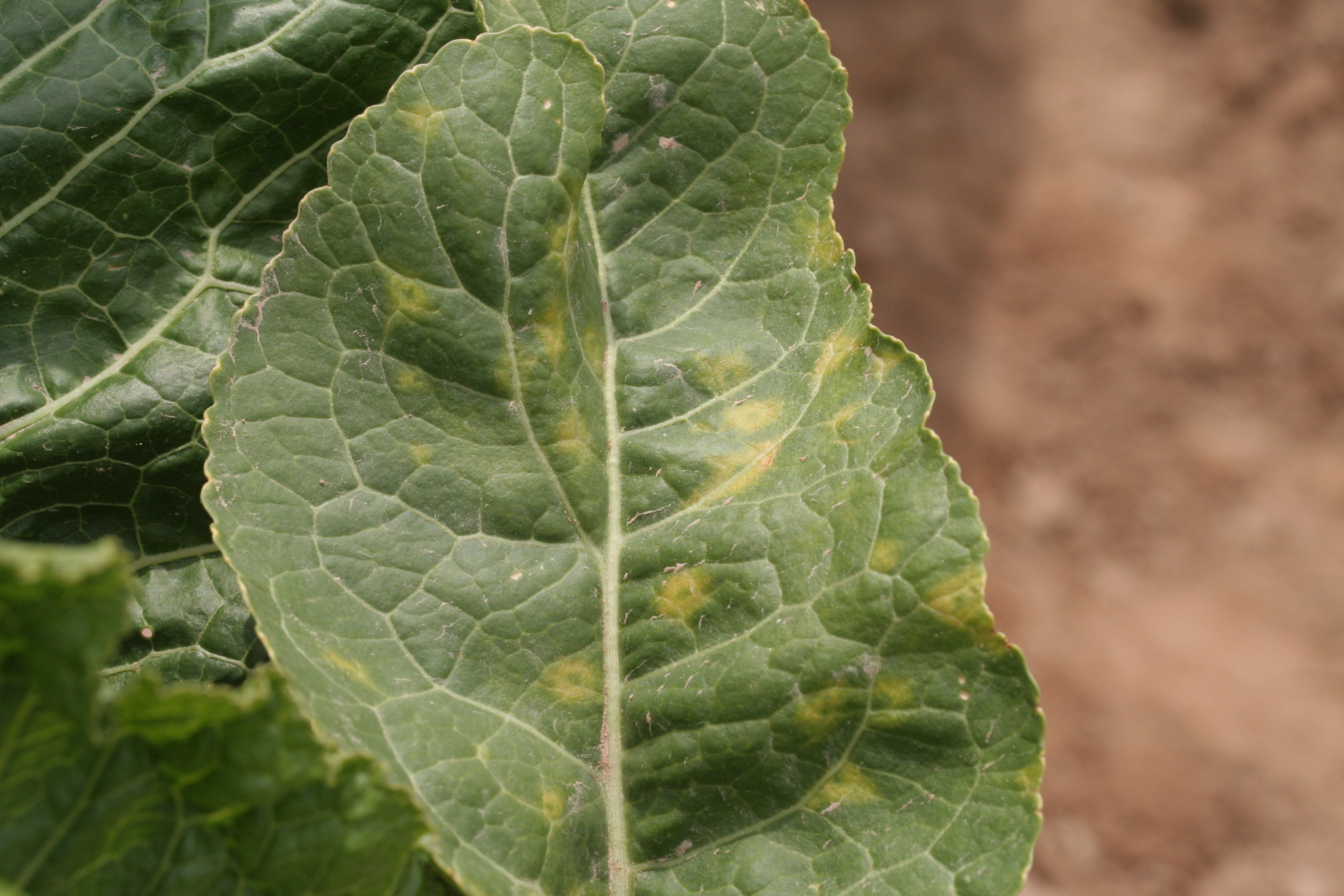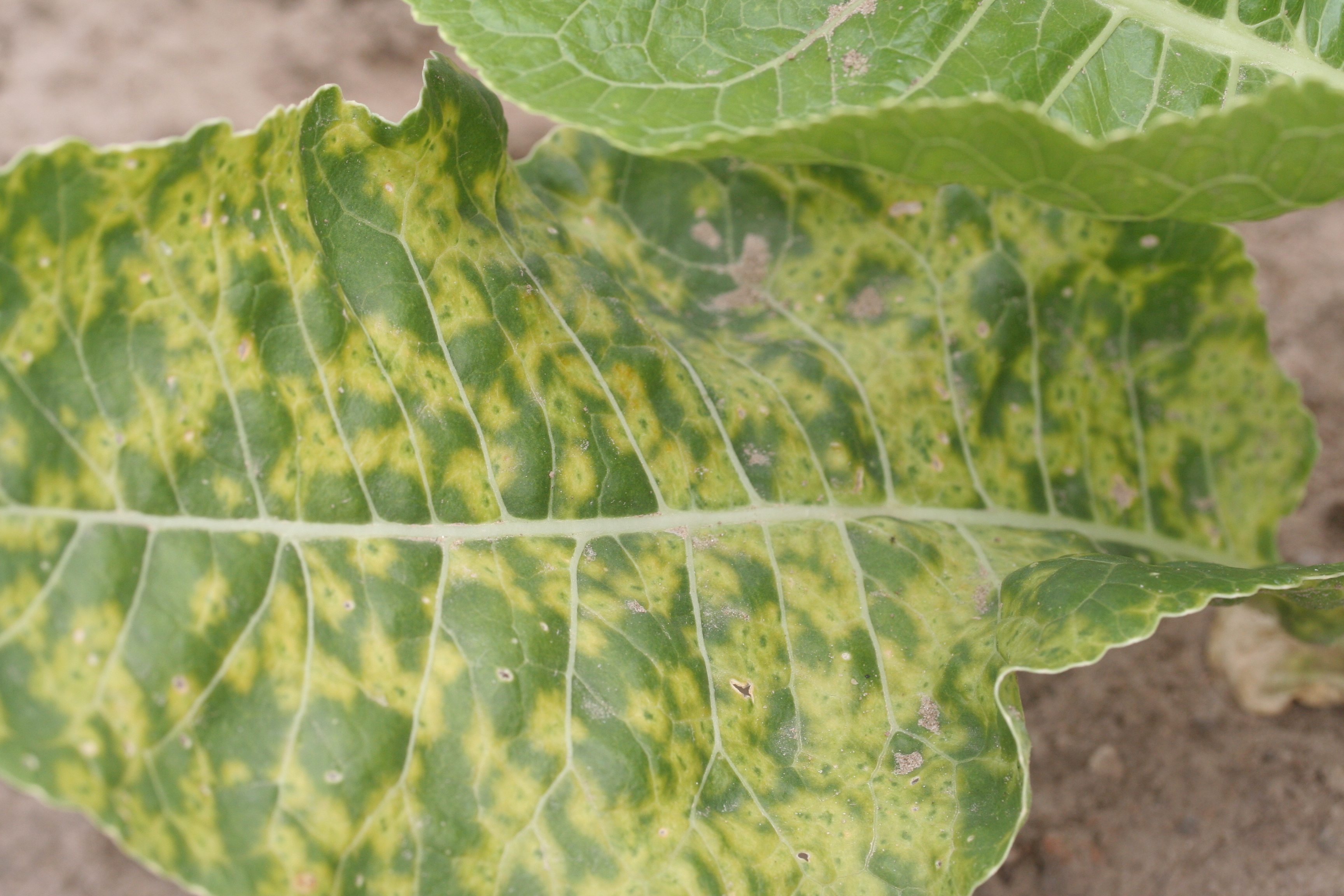 Auf fast allen untersuchten Flächen fanden die Forscher das Turnip Mosaic Virus. Typische Symptome: ringförmige Chlorosen, flächige Vergilbungen und diffuse gelbe Muster auf den Blättern. Virus-Überträger sind Vektoren wie Blattläuse, kontaminierte Werkzeuge oder der Durchwuchs der letzten Jahre, aber auch Unkraut am Feldrand. Neben strenger Hygiene verspricht vor allem gesundes Pflanzgut Erfolg. Da Meerrettich vegetativ, also über Wurzelstücke, sogenannte Fechser, vermehrt wird, vermuten die Forscher, dass in fast allen Betrieben krankes Pflanzgut verwendet wird. Für die Bekämpfung von Viren stehen keine Pflanzenschutzmittel zur Verfügung, deshalb ist gesundes Pflanzgut das A und O.