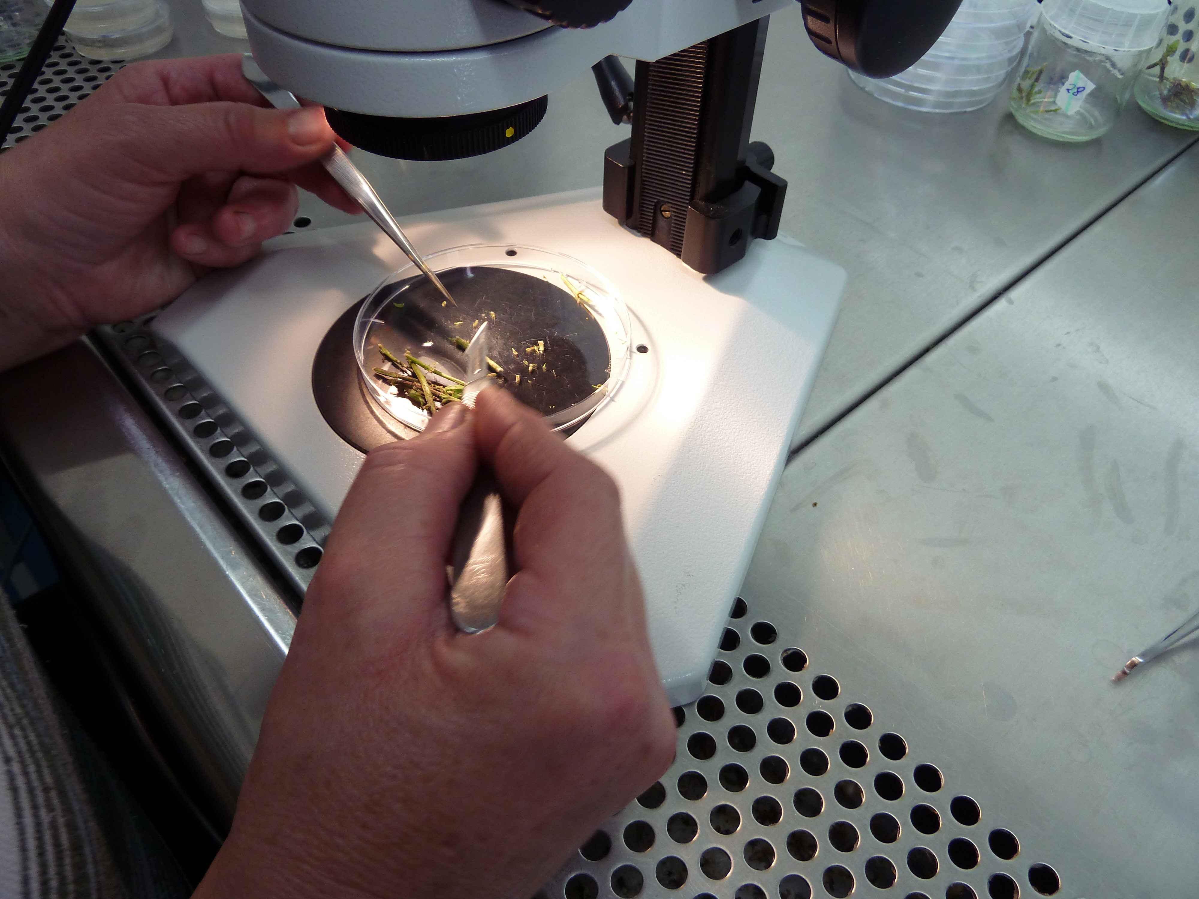 Die Vermehrung von Meerrettichsorten ist normalerweise eine aufwändige und langwierige Angelegenheit. Im Labor lässt sich dieser Prozess durch Meristemkultur beschleunigen: Meerrettichpflanzen werden aus dem Bildungsgewebe, dem sogenannten Meristem, oder aus kleinsten Pflanzenteilen, zum Beispiel Blattstücken, vermehrt. Dieses Verfahren hilft beim Aufbau gesunder Mutterpflanzenbestände. An der Hochschule Weihenstephan-Triesdorf laufen derzeit im Rahmen des Forschungsprojekts Versuche mit dem Ziel, virusfreies Meerrettichpflanzgut zu produzieren.