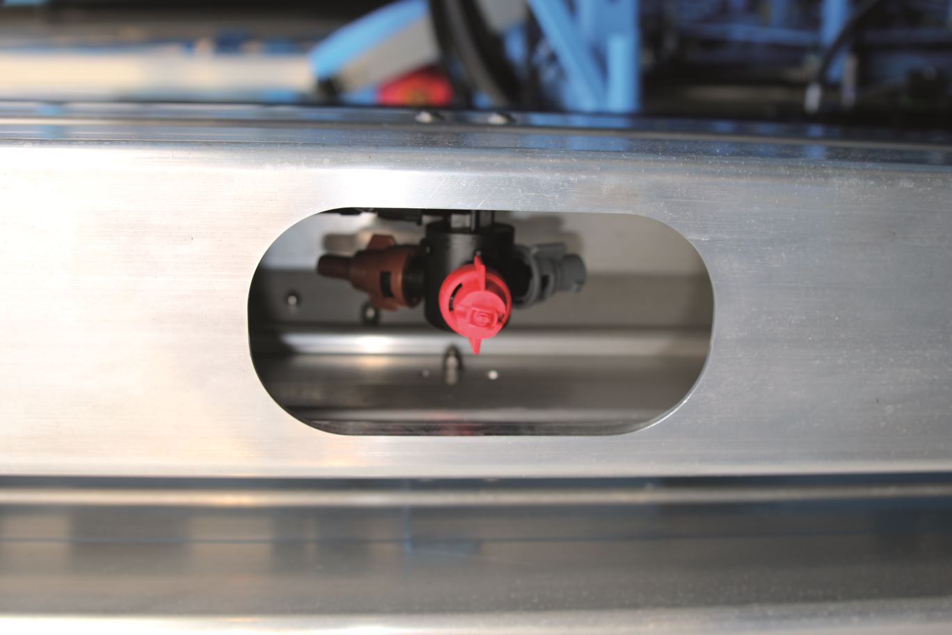Der Weg des Pflanzenschutzmittels durch das Gerät beginnt an der Einspülschleuse. Sie wird vor Gebrauch ausgeklappt. Der Landwirt entleert darin die Pflanzenschutzmittel-Kanister in das durchströmende Frischwasser, das anschließend mit dem aufgelösten Mittel durch Filter in einen großen Behälter für die Spritzbrühe gelangt. In der Schleuse befindet sich eine Düse, durch die die leeren Kanister von innen restlos gereinigt werden können. Die sauberen und trockenen Kanister können Landwirte jedes Jahr kostenlos an einer von bundesweit über 360 Sammelstellen des PAMIRA-Systems sicher entsorgen.