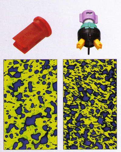 Düsen der gleichen Bauart unterscheiden sich in der Flüssigkeitsmenge, die sie pro Minute ausstoßen können, und im optimalen Druckbereich. Die Faustregel sagt: Je kleiner die Düsenöffnung und je höher der anliegende Druck, desto kleiner werden die Tropfen. Eine Düse, die 0,5 Liter pro Minute ausbringt, ist anders gebaut als eine Düse, die drei Liter ausstößt. Hohe Flüssigkeitsmengen sind erforderlich, wenn dichte Kulturen wie Kartoffeln durchdrungen werden müssen. Ziel ist stets, die beste Wirkung, mit möglichst wenig Mittelaufwand zu erzielen und die Umwelt zu schonen.