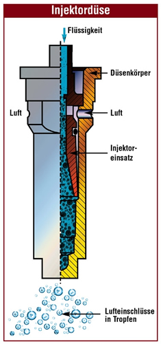 „Mittels ‘Venturi- Prinzip’ wird Luft eingesaugt und in die Flüssigkeit teilweise eingemischt. Je nach Mittel entstehen dabei große abdriftfeste ’Blasentropfen’. Durch den Druckabbau in der Mischkammer und den großen Düsenauslass der Injektordüse wird der Feintropfenanteil praktisch eliminiert.“ Wer diese Beschreibung liest, könnte an Einspritzdüsen bei Sportwagen denken, aber es geht um ein Pflanzenschutzgerät, die so genannte Air-Injektordüse. Dieser Düsentyp kann relativ große Tropfen erzeugen. Sie sind entsprechend schwer und werden nicht so schnell verweht wie feine Tröpfchen. Das senkt die Abdrift um 50 bis 90 Prozent. An Feldrändern mit Blühstreifen, Hecken oder angrenzenden Gewässern sind diese Düsen gesetzlich vorgeschrieben. Die Injektordüse hat die früher dominierende Flachstrahldüse abgelöst.