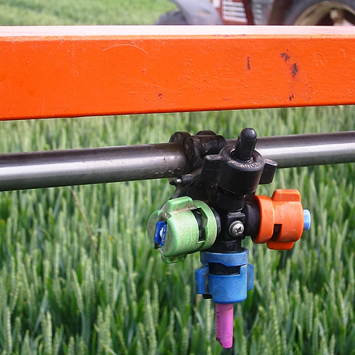 Trotz unterschiedlichster Anforderungen hätten Landwirte am liebsten eine Universallösung: Eine Düse für alles würde Kosten senken und das zeitaufwändige Wechseln der Düsensätze überflüssig machen. Doch die Universaldüse kann immer nur ein Kompromiss sein, der mit zum Teil erheblichen Wirkungsverlusten teuer erkauft wäre. Daher setzen viele Landwirte auf zwei oder drei verschiedene Düsentypen. Den schnellen Wechsel ermöglichen Mehrfachdüsenträger. Hier befinden sich Düsen verschiedener Typen an einem drehbaren Träger. Die Düsen, die senkrecht nach unten stehen, werden mit Spritzbrühe versorgt.