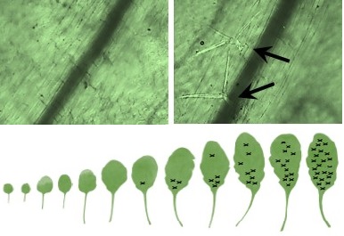 Sichtbares Zeichen des Erwachsenseins sind bei der Ackerschmalwand kleine Härchen, Trichome genannt, die auf den Blattunterseiten entstehen. Während die jungen Blätter keine Blatthaare auf der Blattunterseite haben, sind die Blätter einer erwachsenen Pflanze hingegen mit Trichomen versehen. Das Team um Professor Thomas Schmülling fand heraus, dass genetisch veränderte Mutanten mit einer erhöhten Cytokinin-Produktion früher „erwachsen“ werden. Sichtbar war das an den Trichomen an den Blättern. Umgekehrt verharrten Mutanten mit niedrigem Cytokininspiegel deutlich länger in der juvenilen Phase.