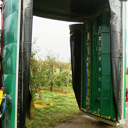 Krankheiten und Insekten können Obstbäumen und Rebstöcken im Frühjahr und Sommer ganz schön zusetzen. Für maximalen Schutz der Kulturen bei minimalem Einsatz von Pflanzenschutzmitteln haben Maschinenhersteller bereits vor Jahren Tunnelsprühgeräte mit Recyclingtechnik entwickelt. Am Kompetenzzentrum für Obstbau in Jork (Altes Land) werden nun verschiedene Ausführungen für den Obstbau auf ihre Praxistauglichkeit getestet.Recycling ist seit mehreren Jahren ein Thema bei Obstbauern und Winzern. Allerdings geht es hier nicht um die Verwertung von Abfall, sondern um das Auffangen von Sprühbrühe, die nicht auf der Pflanze angelagert wurde. Die herkömmlichen Ausbringungsgeräte arbeiten mit einem Gebläse, das die Tröpfchen der Brühe mehr oder weniger in die Kultur „drückt“. Dabei trifft nur ein Teil der Flüssigkeit auf Blätter und Äste, der Rest gelangt auf den Boden. Das verhindert die Recyclingtechnik. Die Maschine schottet Bäume, Sträucher oder Rebstöcke nach oben und zu den Seiten hin mit Reflektorwänden ab, so dass sich die Kultur in einem „Tunnel“ befindet. Die nicht angelagerten Tröpfchen treffen auf die Wände und laufen in einem Sumpf zusammen. Anschließend wird die Flüssigkeit gefiltert und in den Tank zurückgeführt.