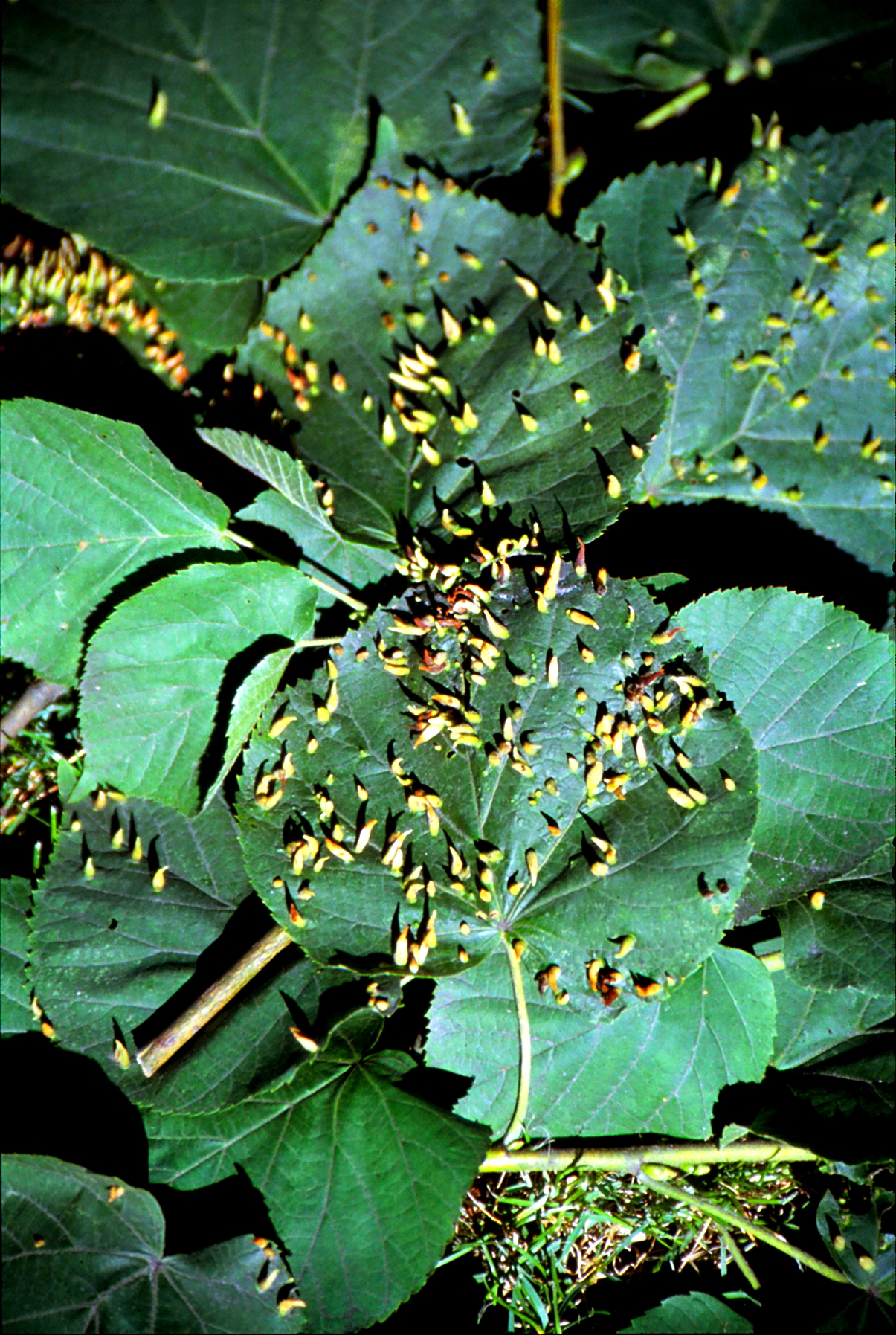 Beim Auftreten der Nervenwinkelgallmilbe Eriophyes exilis entstehen in den Winkeln von Blattnerven rundliche Ausstülpungen oberhalb. Aus den blattunterseits offenen Gallen ragen feine Haarbüschel heraus.