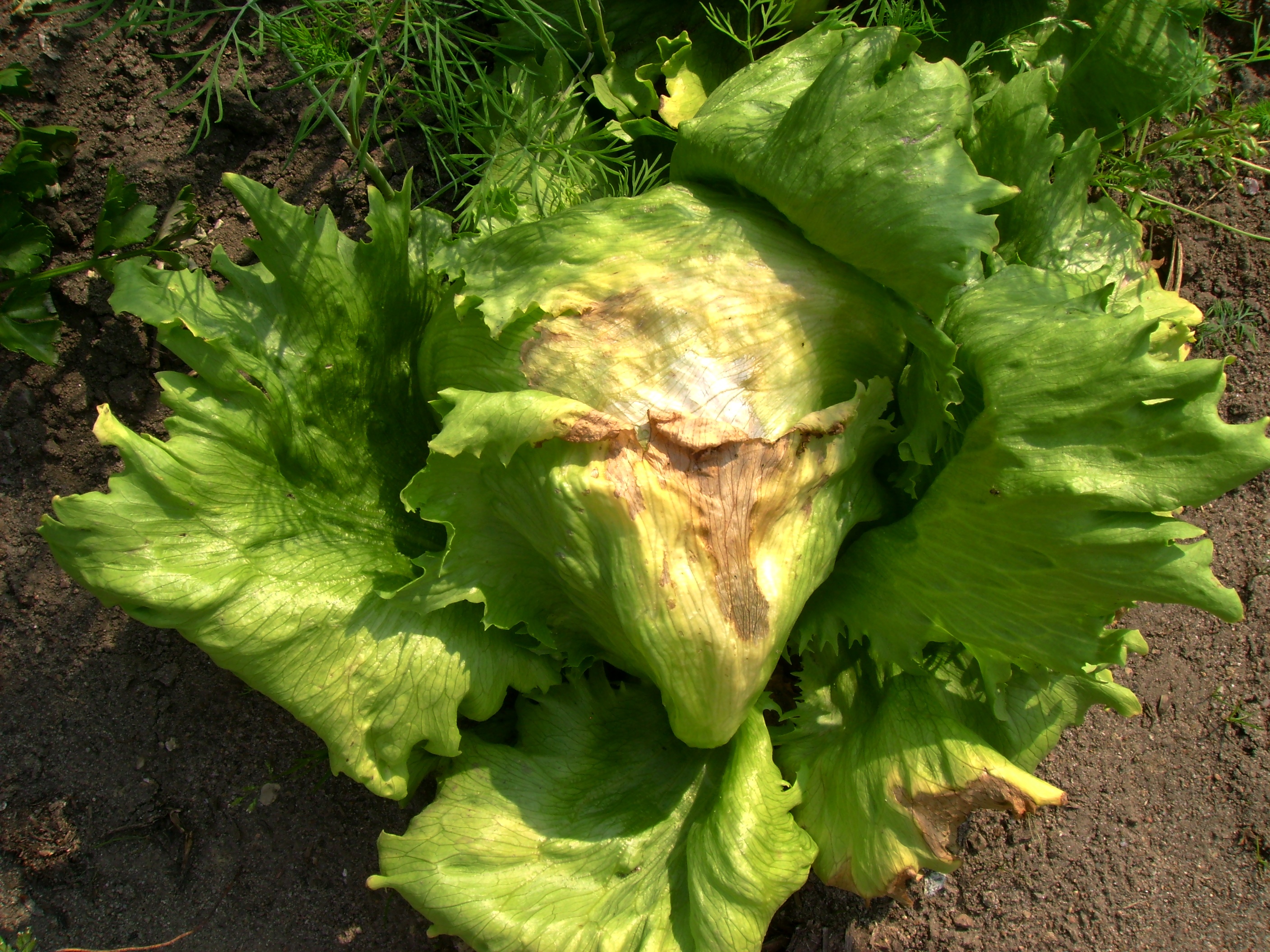 Direkt der Sonne ausgesetzte Köpfe vom Eisbergsalat zeigen teilweise Verbrennungen, die über mehrere Blattlagen bis ins Innere reichen können und so den Ertrag und Marktwert der Köpfe stark beeinträchtigen.