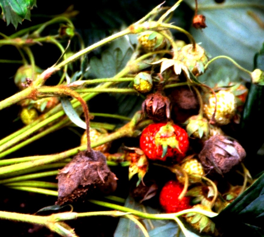 Die Grauschimmelfäule (Botrytis cinerea) ist die bedeutendste Krankheit an Erdbeerfrüchten. Hauptsächlich während der Blütezeit dringt der Erreger über Staubgefäße, Kelch- und Blütenblätter in den Blütenboden ein. Er kann aber auch an jeder anderen Stelle infizieren. Bei Kontakt der Beeren mit dem Boden oder mit befallenen Früchten infizieren sich die Seitenflächen. Feuchtes Wetter während der Blütezeit fördert den Befall, ebenso feuchte Lagen und zu enge Pflanzabstände. Auf infizierten Erdbeeren bilden sich bräunliche Flecken. Die Früchte werden weichfaul, und es entwickelt sich ein grauer Schimmelrasen. Zugelassene Fungizide können vor, während und zum Ende der Hauptblüte eingesetzt werden.