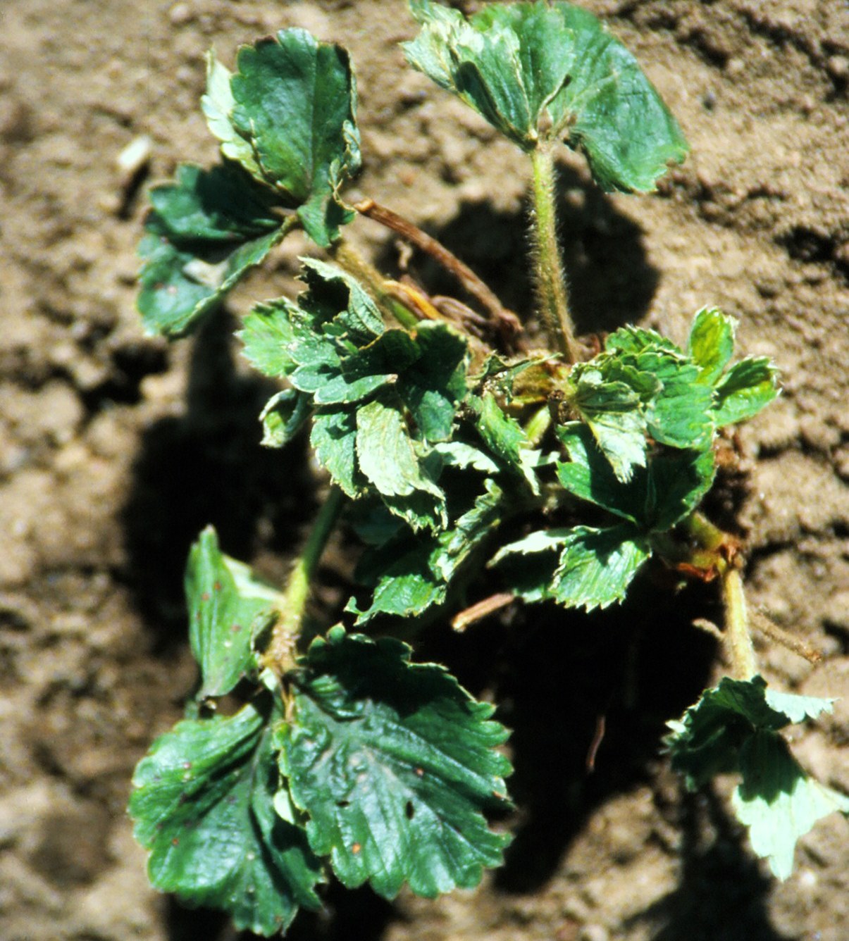 Die Erdbeermilbe (Tarsonemus pallidus) bewirkt, dass sich die Herzblätter kräuseln und klein bleiben. Der Weichhautmilbenbefall führt nicht immer zum Absterben, beeinträchtigt jedoch die Ertragsleistung. Feuchte Witterung und hohe Luftfeuchte kommen den mikroskopisch kleinen Erdbeermilben zupass. Zum Ende der Ernteperiode vermehren sie sich am stärksten. Eine Bekämpfung mit zugelassenen Insektiziden ist nach der Ernte besonders effektiv. Sind die Mutterpflanzenbestände befallen, dürfen keine Jungpflanzen entnommen werden.