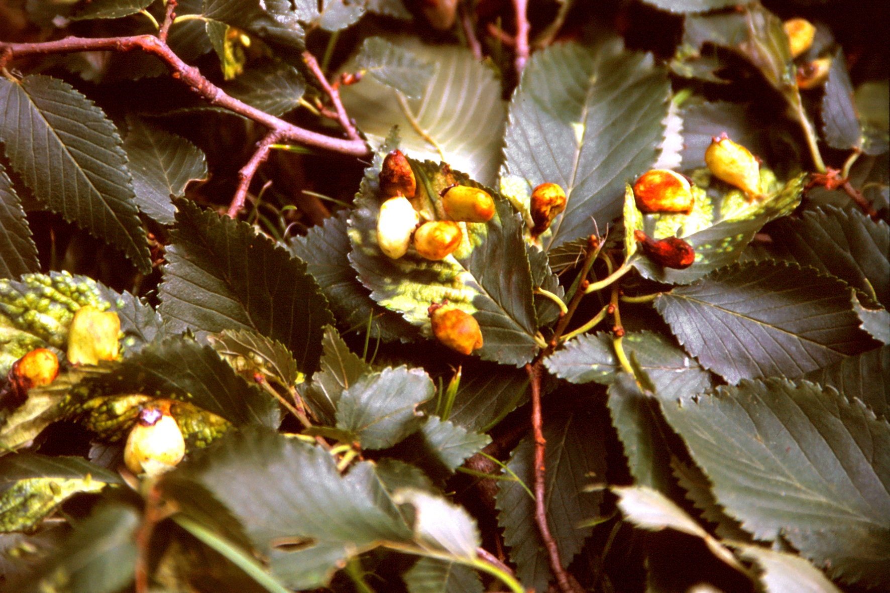 Bohnenförmige Auswüchse auf den Blättern verschiedener Ulmenarten weisen auf einen Schädling namens Byrsocrypta ulmi hin. Diese Laus bildet durch ihre Saugtätigkeit zahlreiche glatte, bohnenförmige, kurzgestielte Blattgallen. Sie sind etwa 1,5 Zentimeter groß und anfangs grün. Später werden sie cremefarben und schließlich rötlich bis braun. In den Gallen leben hellgelbe bis gelblichweiße Läuse, die mit weißlicher Wachswolle umgeben sind. Im Sommer verlassen geflügelte Individuen die Gallen und fliegen auf Gräser, wo sie an den Wurzeln leben. Es gibt keine Hinweise, ob diese Sommerwirte geschädigt werden. Im Herbst wandern die Läuse auf die Ulme zurück und legen ihre Wintereier ab. Die Gallen sind sehr auffällig, doch ist der Schaden zum Glück meist gering. Eine gezielte Bekämpfung ist bisher noch nicht erforderlich geworden.