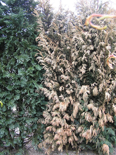 „In erster Linie sind urbane Zentren befallen, in denen viele Koniferen gepflanzt wurden“, erklärt Manfred Lehmann vom Landesamt für Verbraucherschutz, Landwirtschaft und Flurneuordnung LVLF in Frankfurt an der Oder. „Ich gehe davon aus, dass die Schädlinge aus den Niederlanden eingeschleppt wurden, denn dort traten zum selben Zeitpunkt die gleichen Probleme wie bei uns auf.“ Zu den Borkenkäfern an zypressenartigen Koniferen zählen der Zweifarbige Wacholderborkenkäfer (Phloeosinus aubei), der Thujasplintkäfer (Phloeosinus thujae) und der japanische Thujabastkäfer (Phloeosinus rudis). Wacholderborkenkäfer und Thujasplintkäfer wurden vermutlich schon vor Jahren mit Ziergehölzen eingeschleppt und sind mittlerweile in Deutschland heimisch.