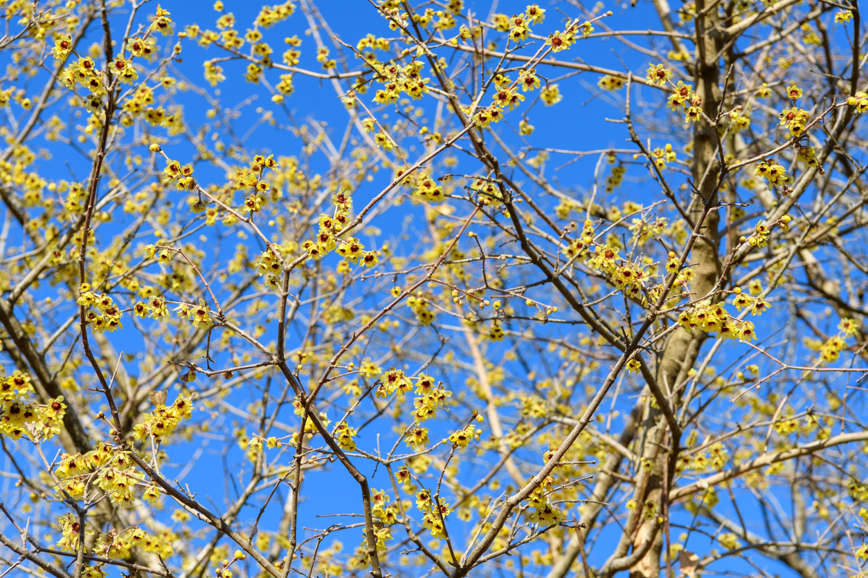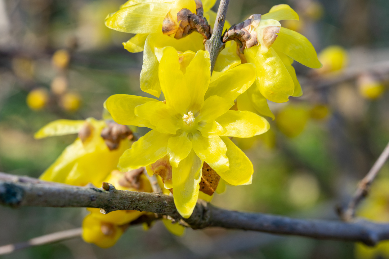 Die Chinesische Winterblüte (Chimonanthus praecox) gehört zur Familie der Gewürzstrauchgewächse und stammt aus den Gebirgswäldern im Osten Chinas. Anders als dort wächst sie in Europa nicht als großer Strauch, sondern wird höchstens 3 Meter hoch und 2 Meter breit. Seit dem 18. Jahrhundert verbreitete sich das Gehölz in Parks und Grünanlagen, aber auch in privaten Gärten. Im eher tristen Grau der Wintertage sind die oft gelben Blüten sonnige Lichtblicke. Die ursprüngliche Art der Winterblüte trägt allerdings cremeweiße bis gelbliche Blüten, deren kleine innere Blütenblätter dunkelrot gefärbt sind.