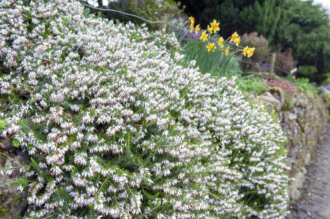 - Erica carnea „Snow Queen“ besticht mit frischgrünem Laub und weißen Blüten, die sich von Januar bis April zeigen.