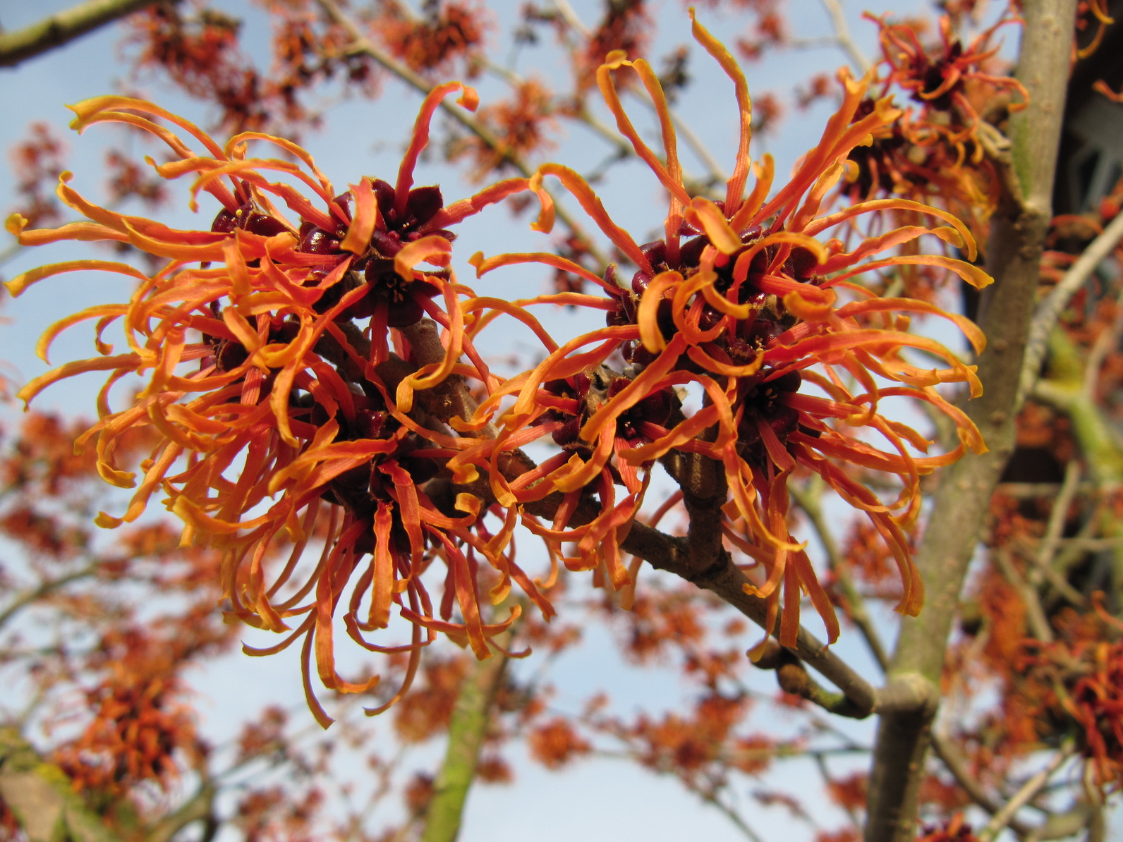 Hamamelis intermedia 'Jelena': Sie blüht bereits ab Dezember bis teilweise Ende März. Ihre großen Blüten sind orangerot bis kupferfarben gefärbt und gehen zu den Spitzen hin in orange bis orangegelb über. Das Laub leuchtet im Herbst orange bis scharlachrot.