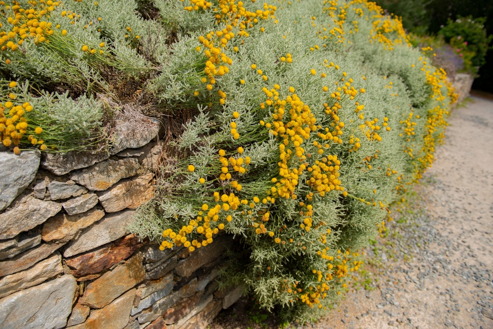 Im Beet wird ein Pflanzabstand von etwa 40 Zentimetern empfohlen. Beim Anlegen einer duftenden Mini-Hecke darf der Abstand zwischen den Pflanzen geringer sein, etwa 25 Zentimeter. Weil Zypressenkraut karge und trockene Untergründe liebt, ist es auch bestens für den Steingarten oder eine Trockenmauer geeignet. Wegen der ähnlichen Standortvorlieben sind Kombinationen mit anderen mediterranen Pflanzen wie Lavendel und Salbei ideal. Zypressenkraut ist nicht nur wegen seiner Trockenheitstoleranz pflegeleicht. Die in der Pflanze enthaltenen ätherischen Öle schützen sie vor auch vor Krankheitserregern und Schädlingen.