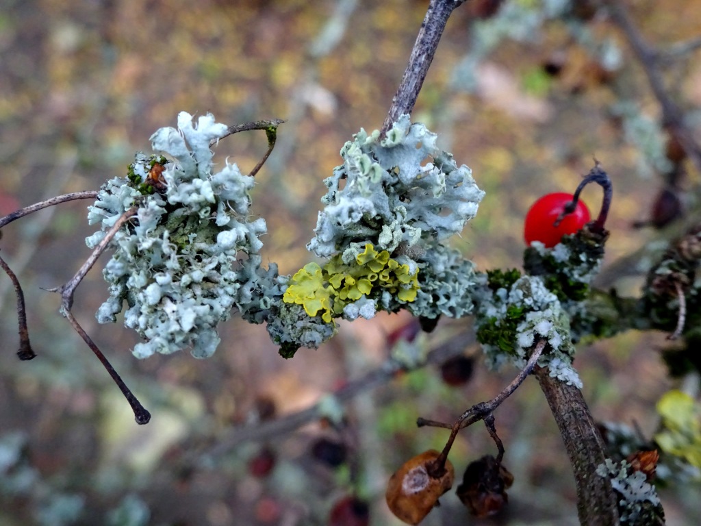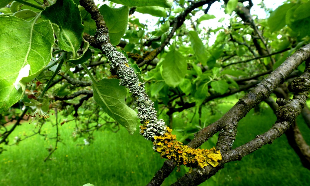 Flechten entstehen aus einer Symbiose von Algen und Pilzen. Dabei nehmen die Pilze Wasser und Nährstoffe direkt aus der Luft auf, und die Algen versorgen die Pilze mit zuckerhaltigen Verbindungen, die diese selbst nicht produzieren können. Flechten bilden verschiedene moosartige, grünliche, braune oder gelbliche Beläge auf Stämmen, Ästen und Zweigen. Diese haben allgemein keinen direkten Einfluss auf die Bäume. Ein indirekter Einfluss besteht nur bei üppigem Besatz darin, dass durch sie Regen- und Taufeuchtigkeit länger an den Bäumen verbleiben kann und Schädlingen, aber auch Nützlingen Unterschlupf gewährt wird. Wenn allerdings Triebspitzen, das Fruchtholz oder die Knospen insbesondere bei Obstbäumen von Flechten überwuchert werden, kann der Fruchtansatz gemindert werden. Auch bei Ziersträuchern können in diesem Fall Beeinträchtigungen auftreten. Dies ist in letzter Zeit beispielsweise häufiger an Berberitzen beobachtet worden.