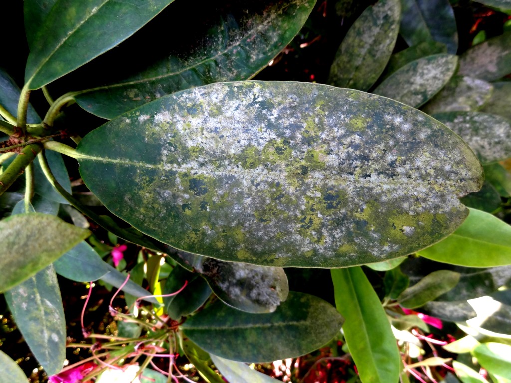 Grüne Beläge auf der Rinde, aber auch auf den Blattflächen, beispielsweise von Rhododendren, werden durch verschiedene Grünalgenarten verursacht. Sie sind vor allem bei einem Mikroklima mit hoher Luftfeuchte und nach längeren regnerischen Perioden zu finden. Sie sind im Gegensatz zu Pilzen durch das Chlorophyll zur Photosynthese in der Lage. In letzter Zeit sind an vielen Gehölzen auffällige rötliche bis rostbraune Verfärbungen der Rinde von Obst- und anderen Laubgehölzen beobachtet worden. Hierbei handelt es sich ebenfalls um Grünalgenarten, die einen braunen Farbstoff eingelagert haben. Es tritt hier vor allem die Rotbraune Fadenalge auf. Da die Grünalgen nur oberflächlich auf der „Unterlage“ aufliegen ist keine Schädigung der Gehölze zu erwarten. Lediglich bei wiederholtem starken Auftreten auf den Blättern immergrüner Pflanzen wie Rhododendron kann eine Behinderung der Assimilation auftreten.