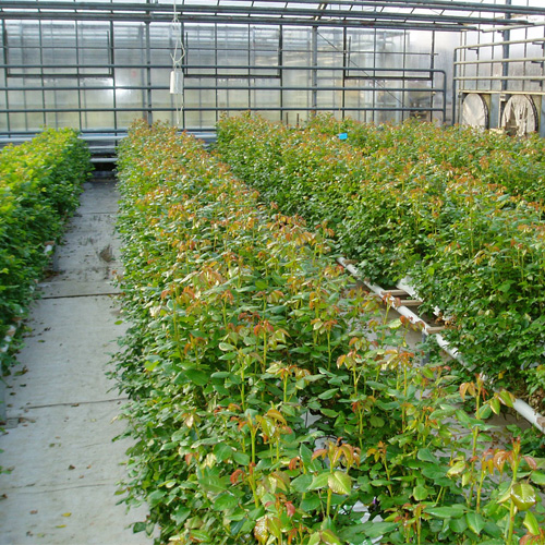 Beim erwerbsgärtnerischen Rosenanbau ist der Pflanzenschutz rund ums Jahr eine wichtige Aufgabe. Im Gewächshaus sind die Pflanzen eher vor dem Frost geschützt und behalten deshalb zum Teil ihre Blätter. Spinnmilben und andere Schädlinge finden deshalb viel besseren Unterschlupf als im Freiland. Da das Barometer selten unter 0 Grad fällt, sterben auch weniger Schädlinge ab. Regelmäßige Kontrolle und Pflanzenschutzmaßnahmen sind daher Gärtnerpflicht. Gegen Schadinsekten werden in Gewächshäusern mittlerweile auch natürliche Feinde, so genannte Nützlinge, erfolgreich eingesetzt. Zum Beispiel können Spinnmilben, die sowohl im Hausgarten als auch im gewerblichen Anbau gefürchtet sind, mit Raubmilben bekämpft werden. Pilzliche Krankheiten werden in der Regel mit Fungiziden bekämpft. Bei einem Mehltau-Befall, der sich rasch ausbreitet, ist es oft notwendig, den ganzen Bestand zu behandeln. Bei der Blattfleckenkrankheit, die weniger ansteckend ist, reicht es oft aus, nur die erkrankten Pflanzen zu behandeln.