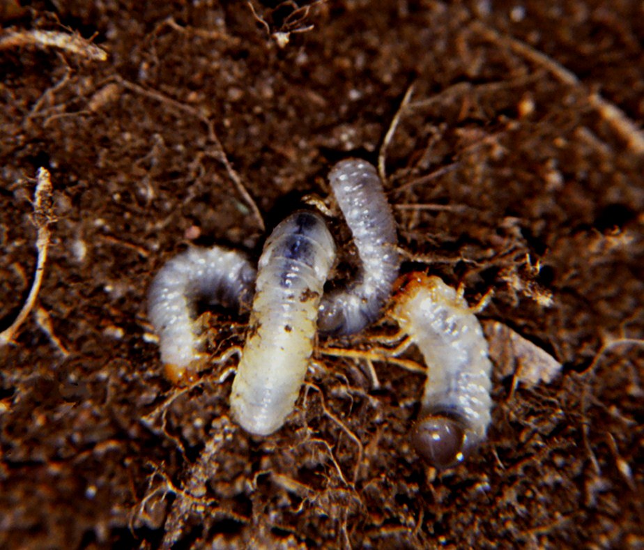 Typische Symptome: Rasenflächen vergilben fleckenweise und sterben ab. Hebt man die Rasensoden an, kommen die Verursacher ans Licht: Die Rasenoberfläche lässt sich teppichartig aufrollen, und in der Übergangszone zu dem noch nicht völlig abgestorbenen Rasen sind die Larven erkennbar. Sie haben eine braune Kopfkapsel und drei Beinpaare. Der Körper ist weißlich, bis 1,5 Zentimeter lang und meist bauchwärts gekrümmt. Sie sind es, die an den Wurzeln der Gräser fressen – zum Schaden des Rasens. Finden sich größere Engerlinge am gleichen Ort, sind es meist ältere Larvenstadien des Maikäfers.