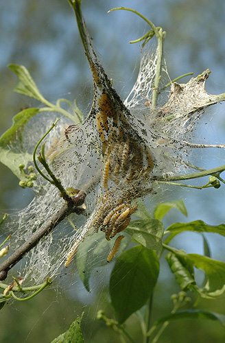 Die Raupen der Gespinstmotten können ganze Bäume mit ihren Gespinsten überziehen und sich unangreifbar machen.