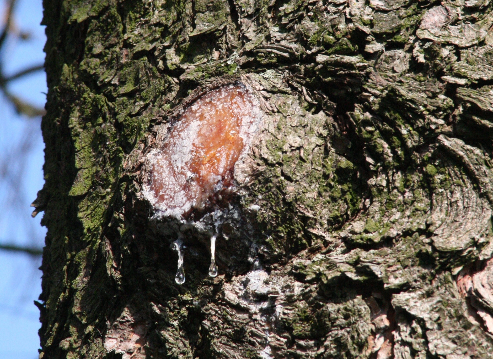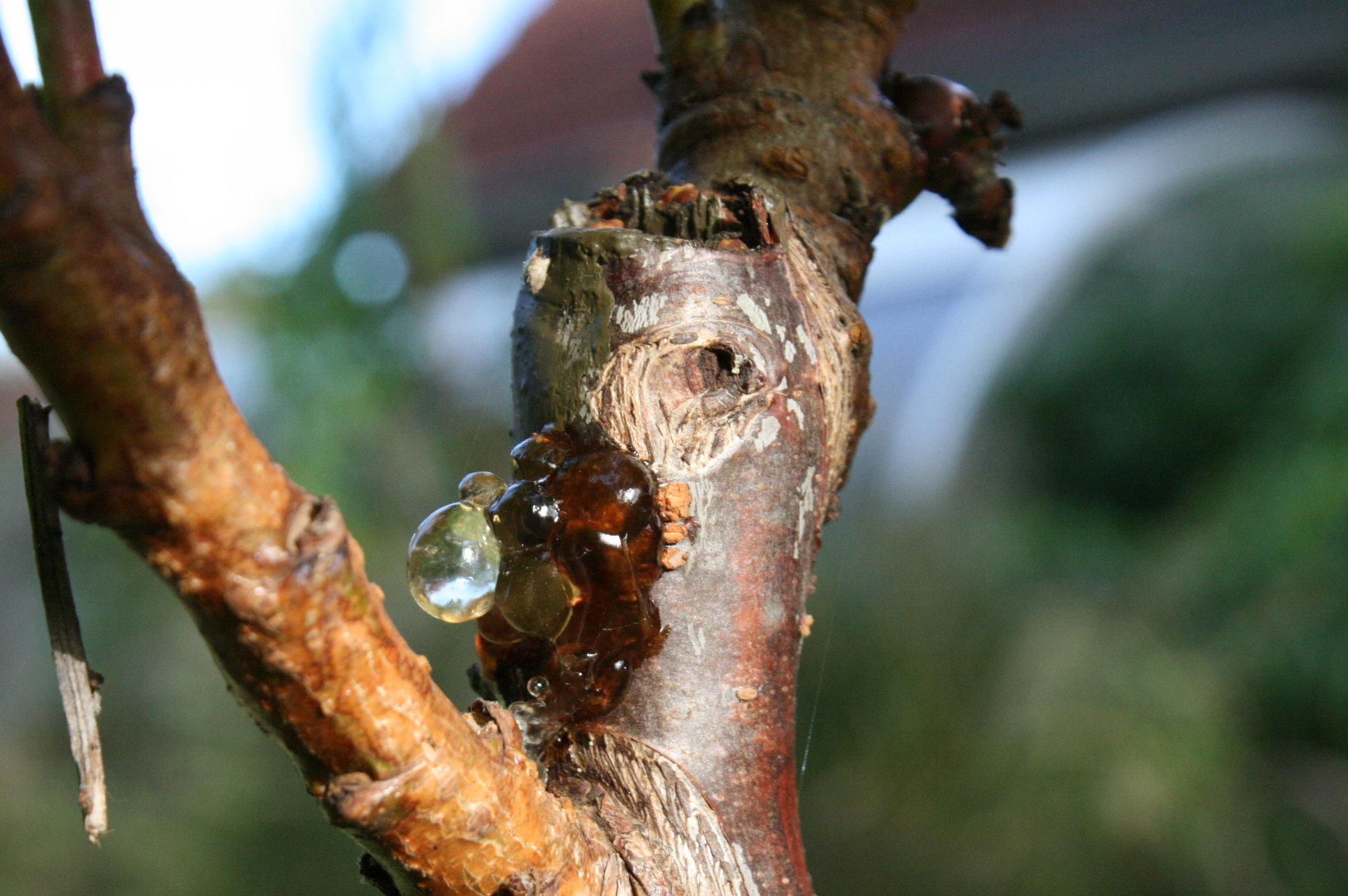 Bei Gehölzen der Gattung Prunus (Pfirsich, Aprikose, Kirsche, Pflaume und deren Zierformen) kann ein auffälliger "Gummifluss" auftreten, bei dem aus Wunden oder aus der Rinde eine bernsteinfarbene Flüssigkeit austritt, die zunächst gummiartig zäh ist und dann hart wird. Dabei handelt es sich nicht wie beim "Bluten" um Wasser aus den Leitungsbahnen, sondern um Zellsaft. Dieser Gummifluss ist ein Zeichen für Stoffwechselstörungen, die die Gesundheit der Pflanzen ernsthaft gefährden können. Der "Gummifluss" selbst schädigt also die Pflanze nicht, ist aber ein Zeichen für eine Gesundheitsstörung. Gefördert wird er durch Staunässe, zu hohe Stickstoffdüngung, verschiedene Krankheitserreger sowie durch ungünstige Schnittzeitpunkte im Frühjahr. Diese Pflanzen sollten Sie daher im Sommer schneiden, wobei allerdings unbedingt Rücksicht auf Vogelnester und andere Lebewesen genommen werden muss. Und im Sommer ist natürlich nur ein leichter Pflegeschnitt sinnvoll, kein starker Rückschnitt.