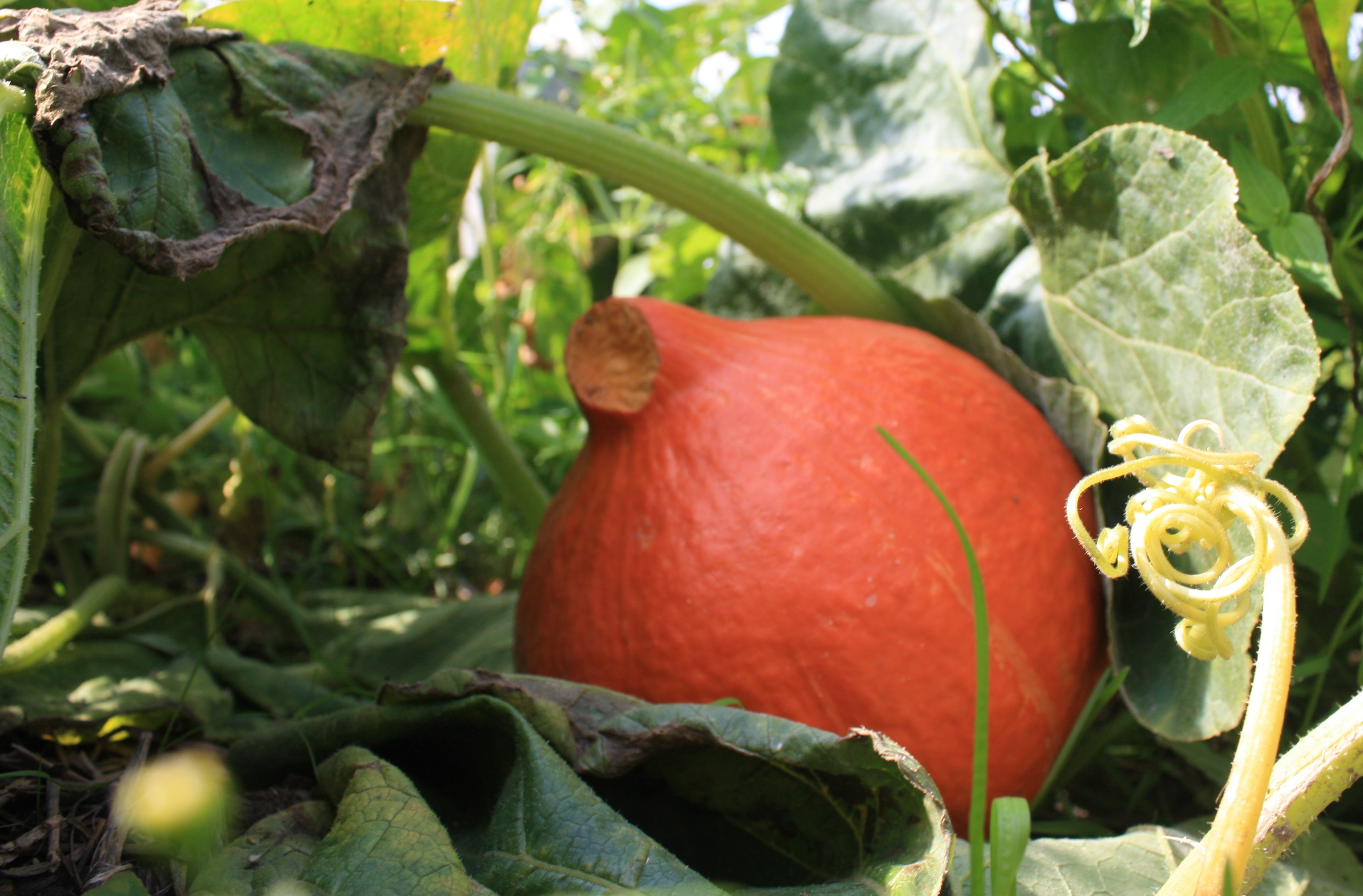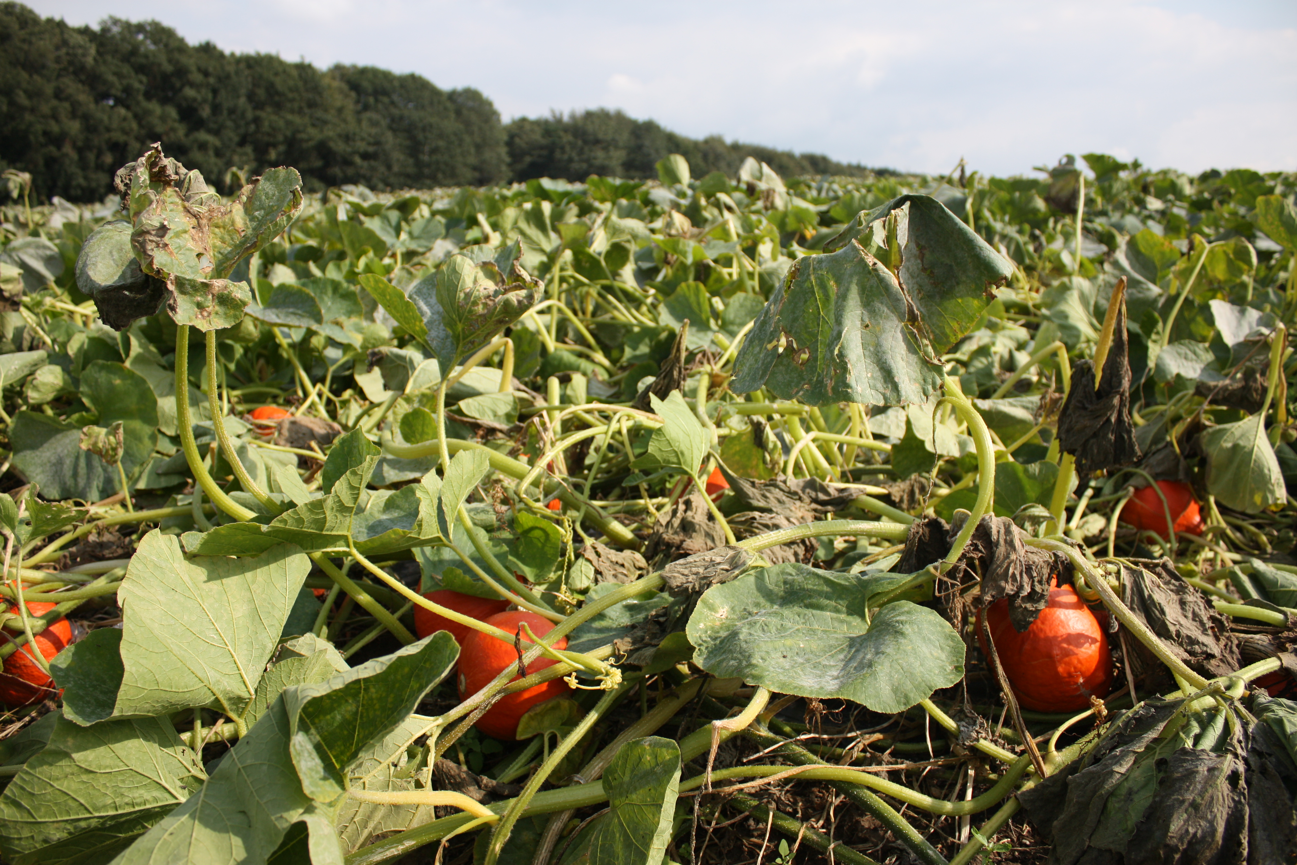 Auf der Kürbisfläche der Familie Lynders schlug der Falsche Mehltau (Pseudoperonospora Cubensis) zu. Doch die pilzliche Krankheit kommt um diese Zeit nicht einmal ungelegen. Lynders hofft, dass sich das Pilzgeflecht auf den Blättern zügig ausbreitet und sie absterben lässt. Dann erst kann die Sonne direkt auf die Kürbisse scheinen. Das wäre genau das Richtige, denn Speisekürbisse brauchen einen sonnigen Herbst, damit die Frucht besser abreifen kann. Der Landwirt bleibt gelassen. Er möchte seinen Bestand möglichst bis Halloween am 31. Oktober nach und nach abernten. So erhalten die Kunden immer frische und reife Ware. Vorausgesetzt die Sonne spielt mit.