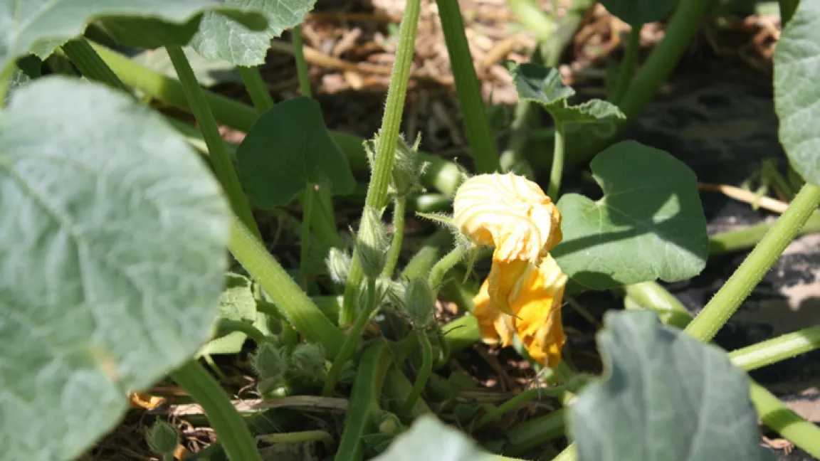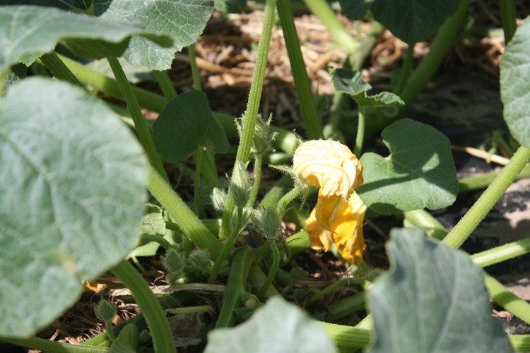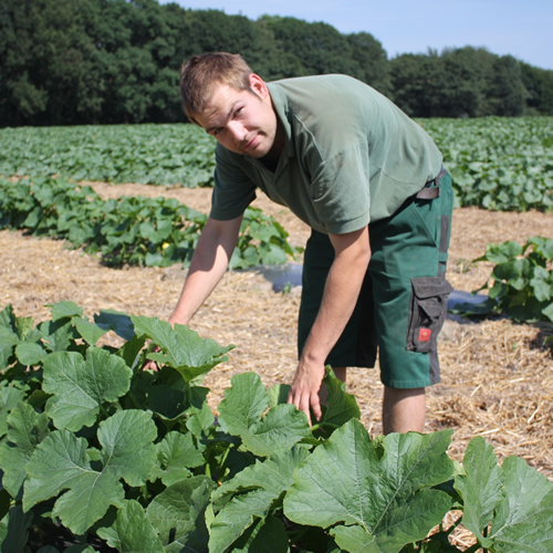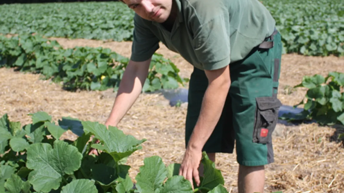 Bis dahin hält Lynders ein wachsames Auge auf seine Kürbisse. Immer wieder schiebt er die Blätter vorsichtig zur Seite und schaut, ob sich Krankheiten wie der Falsche Mehltau (Pseudoperonospora Cubensis) einstellen oder Schädlinge auftreten. Denn obwohl die Kürbisse als sehr robuste Pflanzen gelten, besteht immer die Gefahr, dass Viruserkrankungen, Blattläuse, Schnecken, Erdraupen, Feldmäuse oder Mehltau die Kulturen massiv schädigen.