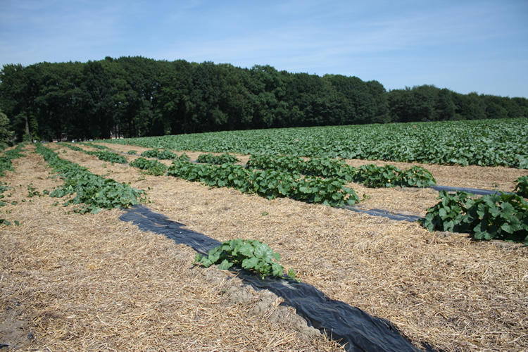 Im Abstand von einem Meter setzt der Landwirt die Kürbispflanzen in die Löcher in der schwarzen Folie. Zwischen den Reihen lässt er jeweils drei Meter Platz, denn Kürbisse sind ungeheuer wuchsfreudig. Dort rollt der Landwirt ein Bett aus Stroh aus. „Wir möchten nicht, dass die Kürbisse im Dreck liegen“, erklärt Lynders. Zunächst wirken die kleinen Pflänzchen in der großen Fläche fast verloren. Bis zum Herbst, wenn die Fürchte geerntet werden, wird die gesamte Fläche bewachsen sein.