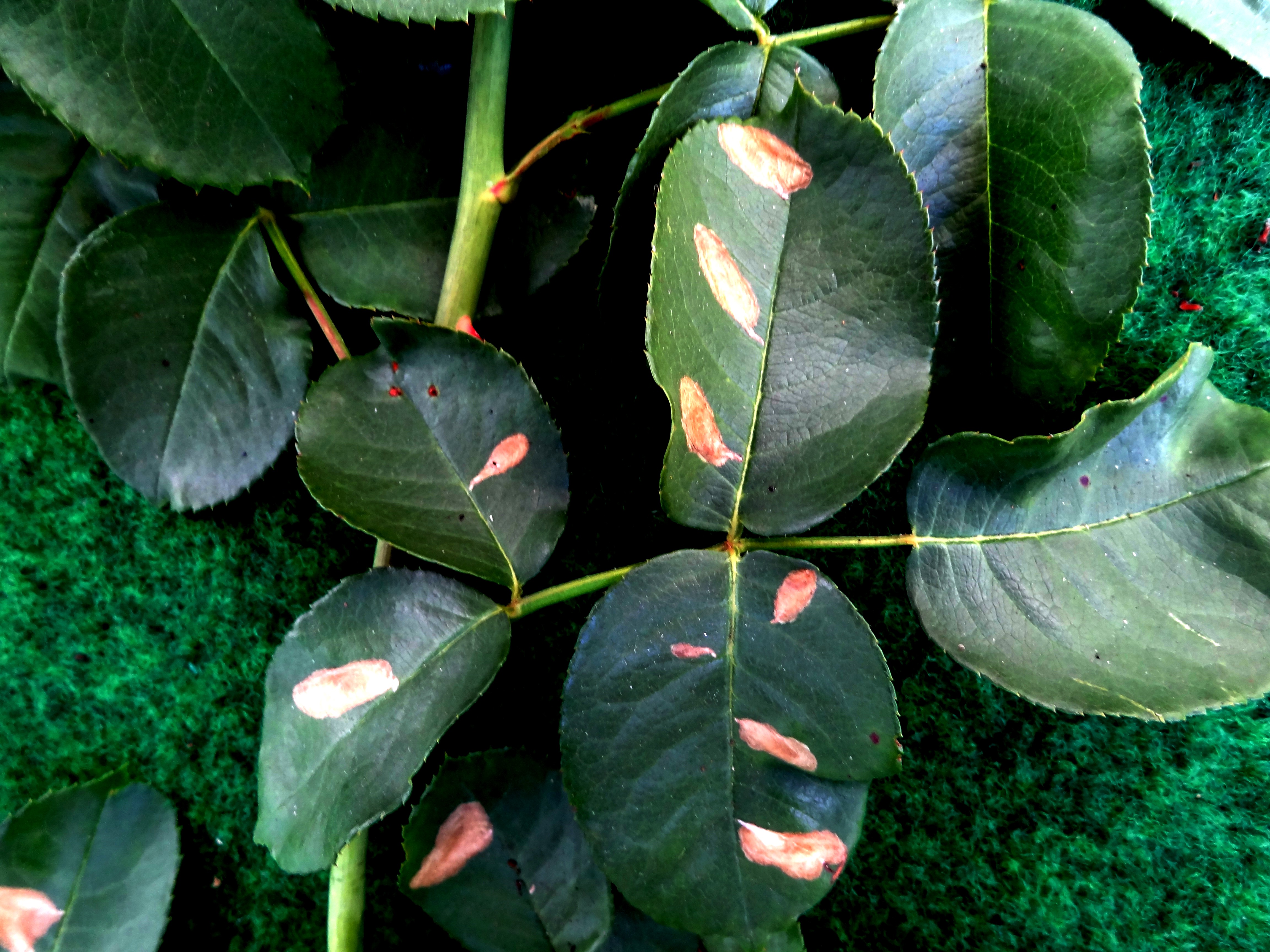 Bei einem Befall mit der Rosenblattminiermotte (Tischeria angusticolella) erscheinen auf den Blättern weiße, unregelmäßige, blasenförmige Platzminen. Sie werden verursacht von kleinen grünen Räupchen in den Blättern. Der dunkelpurpurbraune Falter hat eine Flügelspannweite von 8 bis 9 Millimetern und tritt jährlich in zwei Generationen auf. Die Raupen der 1. Generation schädigen zum Sommeranfang Juni/Juli und die der 2. Generation von September bis Oktober. Bisher wurde örtlich nur ein sporadisches Auftreten, auch an Wildrosen, beobachtet.