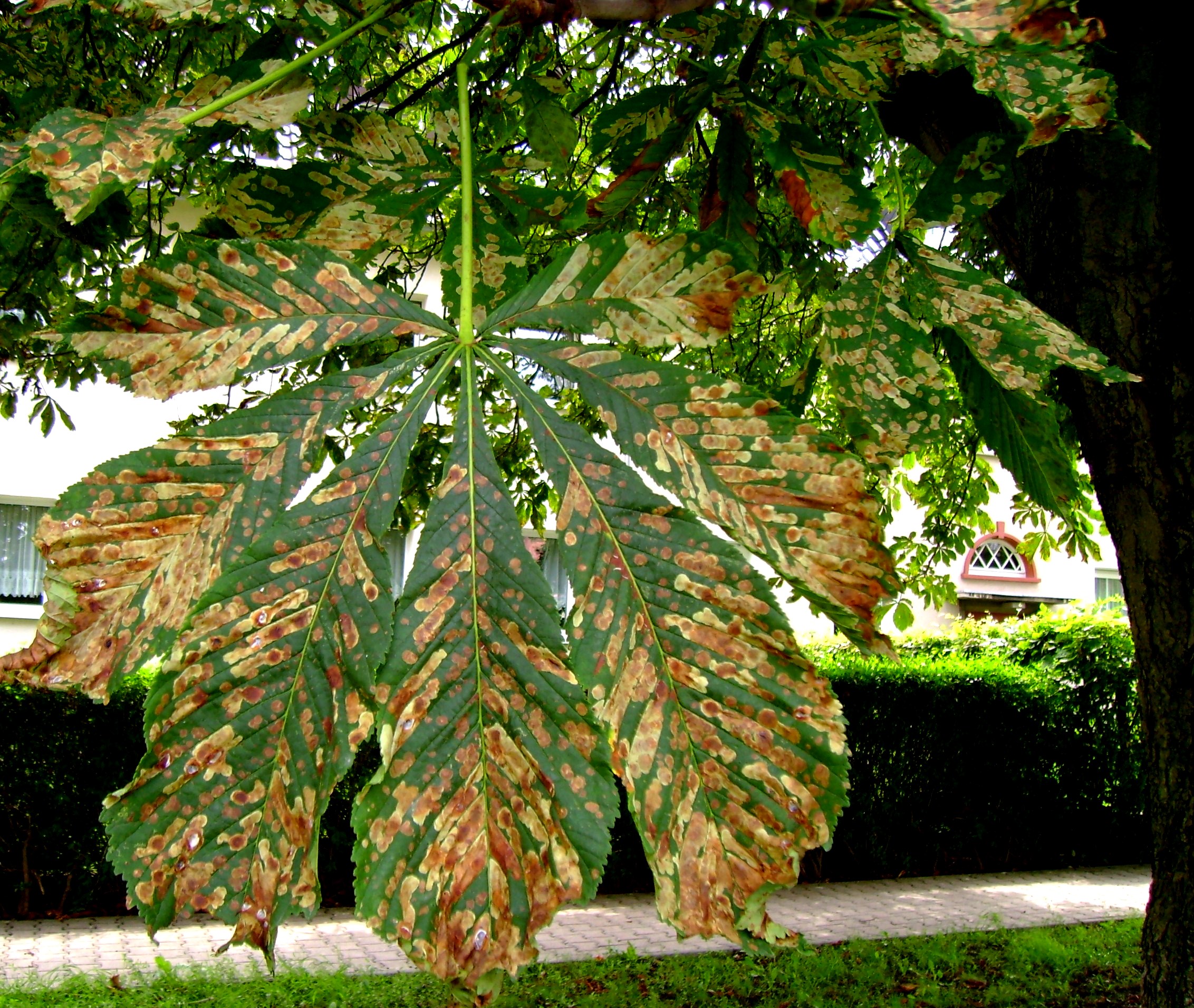 Miniermotten sind eine Familie der Schmetterlinge. Die Falter sind sehr klein, haben schmale Flügel, die häufig gefranst sind. Die Raupen dieser Motten fressen im Inneren der Blätter das Pflanzengewebe soweit aus, dass nur noch die Ober- und Unterhaut übrig bleibt. An diesen Stellen verfärbt diese sich dann meist bräunlich. So kann man die Fraßstellen als Flecken oder Gänge erkennen. Bei manchen Arten sind sie so transparent, dass im durscheinenden Licht die Schädlinge oder ihre Kotreste deutlich zu erkennen sind. Von den zahlreichen Arten stellen wir hier die Kastanienminiermotte, Fliederminiermotte und Rosenminiermotten mit ihren auffälligen Schadbildern vor.Auffällig minierte Kastanienblätter