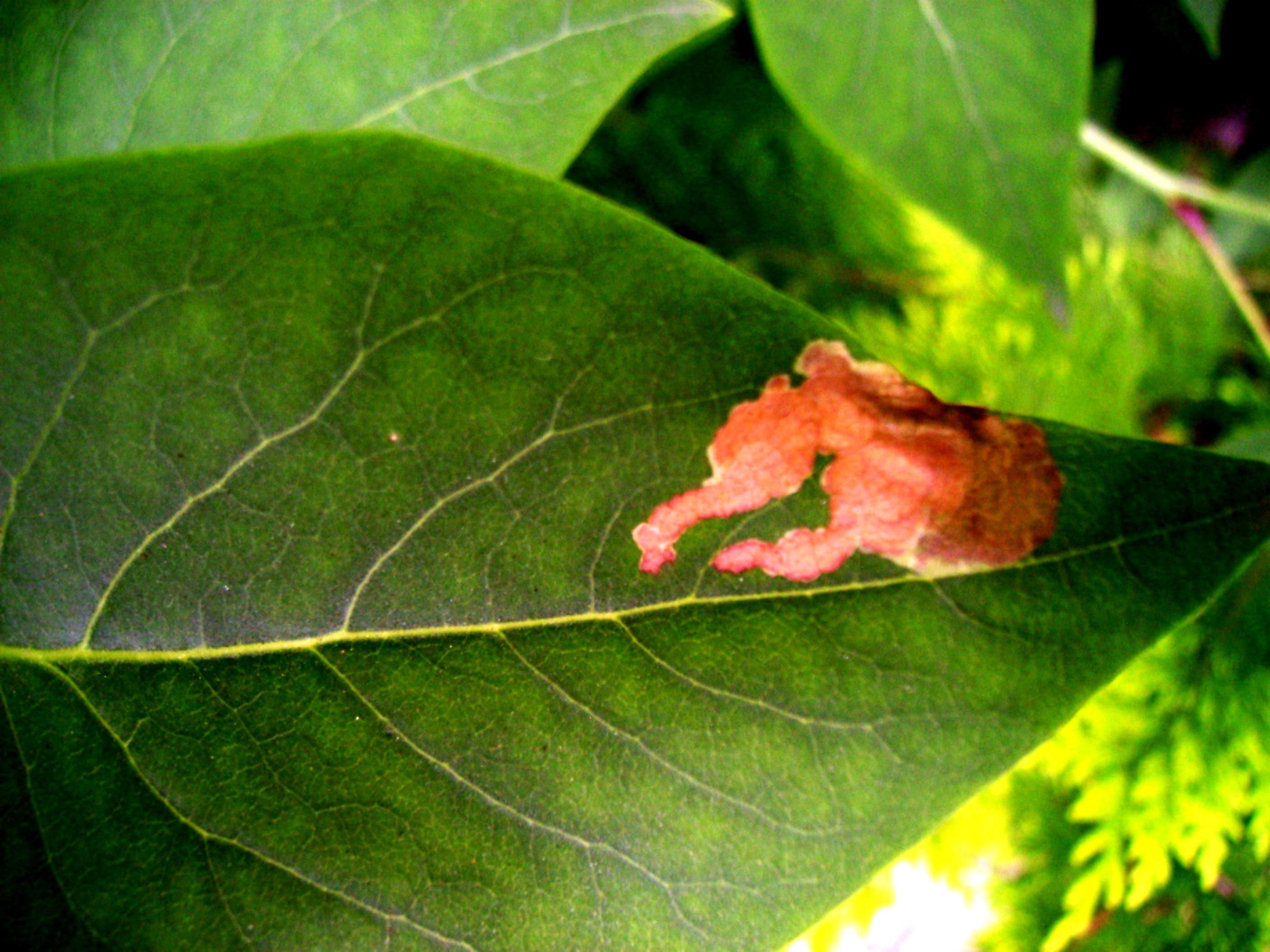 Auf den Blättern werden ab Frühsommer großflächige, unregelmäßige braune, teilweise zusammenschrumpfende Flecken sichtbar. Hier sind die Blätter im Inneren von jüngeren grünlich-weißen bis gelblich-weißen Raupen der Flieder(minier)motte – Xanthospilapterix (Gracillaria) syringella – weggefressen. Dabei entstehen anfangs breite, hellgrün durchscheinende Miniergänge. Sie werden dann zu Platz- oder Blasenminen erweitert. Die Blätter verformen sich. Ältere Raupen rollen mit einem Spinnfaden die Blätter von der Blattspitze nach unten ein. In diesen Blattwickeln sind die bis 7 Millimeter langen Larven und Kotkrümel zu finden. Die Blätter verkrüppeln und können schließlich vollkommen vertrocknen.