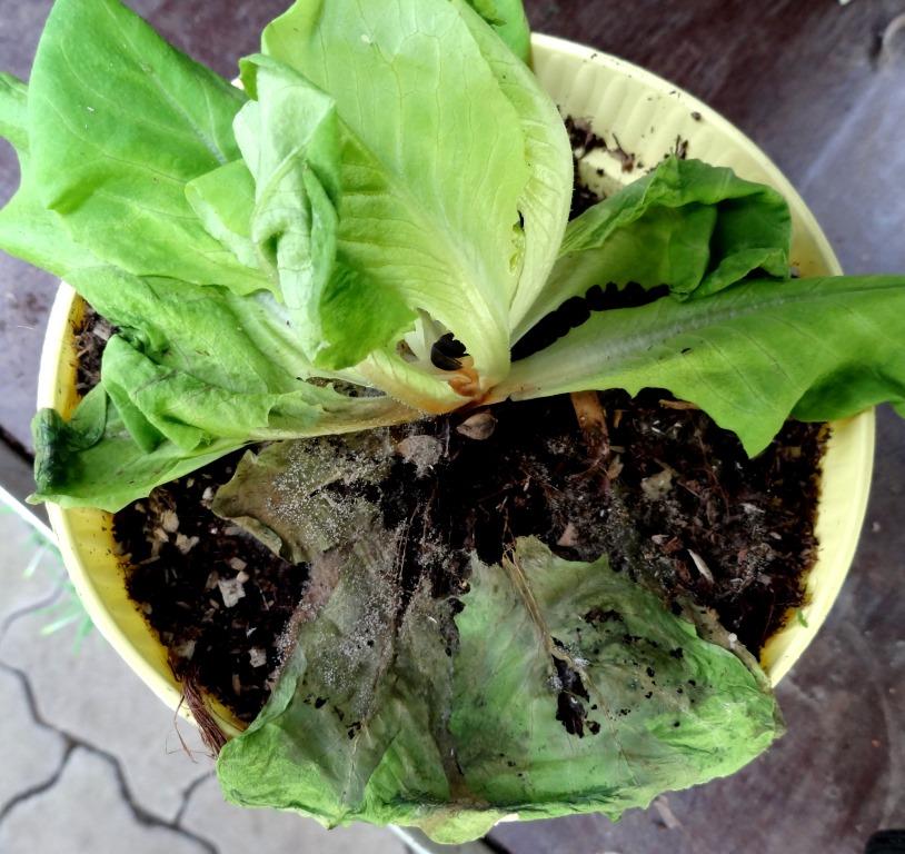 Bei Kopfsalat kann es zur Botrytis-Grauschimmelfäule kommen, wenn zu tief gepflanzt wird. An Jungpflanzen werden dann der Stängelgrund und die unteren, meist auf dem Boden aufliegenden Blätter braun und haben den typischen mausgrauen Schimmelrasen. Schließlich können die Blätter völlig welken und absterben. Beim Anbau im Kleingewächshaus sollte vorbeugend ausreichend gelüftet und nicht in den Nachmittags- oder Abendstunden gegossen werden. So können die Blätter trocken in die Nacht gehen und dem Pilz werden die Infektionen erschwert.