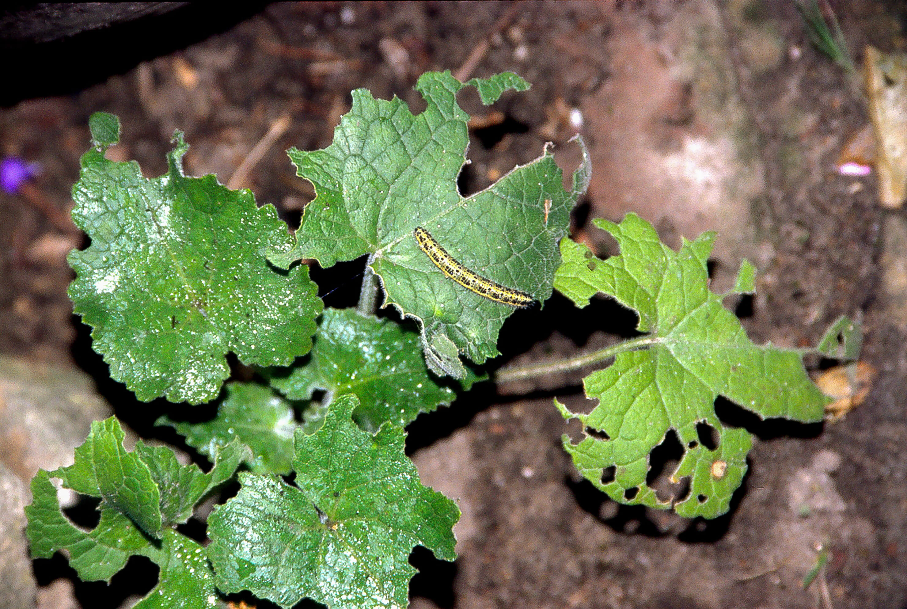 Nach intensivem Flug von Kohlweißlingen muss auch mit einem Raupenauftreten an Mondviolen gerechnet werden. Die anfangs grünlichen, später leuchtend gelben Eier werden häufchenweise zu 20 bis 100 Stück auf den Blattunterseiten abgelegt. Die Eiraupen leben hier zunächst gesellig. Mit zunehmendem Alter verteilen sie sich dann auf die ganze Pflanze, auch auf deren Oberseite. Die bis 5 Zentimeter lang werdenden Raupen sind anfangs hell-, später graugrün bis graugelb gefärbt, mit gelben Längsstreifen und schwarzen Flecken. Sie verursachen an den Blättern zunächst einen Schabe- und später Lochfraß. Schließlich kann es zu Kahlfraßschäden kommen. Der Schädling hat zwei, seltener drei Generationen, von denen die zweite als die gefährlichste einzuschätzen ist. Die Falter der ersten Generation erscheinen von Ende April bis Anfang Juni, die der zweiten von Anfang Juli bis Ende August. In warmen Jahren kommt es im Herbst noch zu einer meist unvollständigen dritten Generation. Der Schädling bevorzugt sonnige, möglichst windstille Lagen und Kleinflächen.