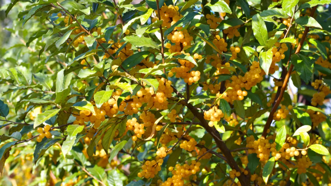 - Elaeagnus umbellata, die Korallen-Ölweide, trägt im Frühherbst rötlich-braune Früchte, die lange am Strauch verbleiben, wenn man sie nicht erntet.