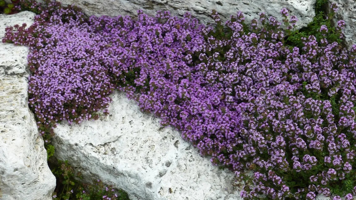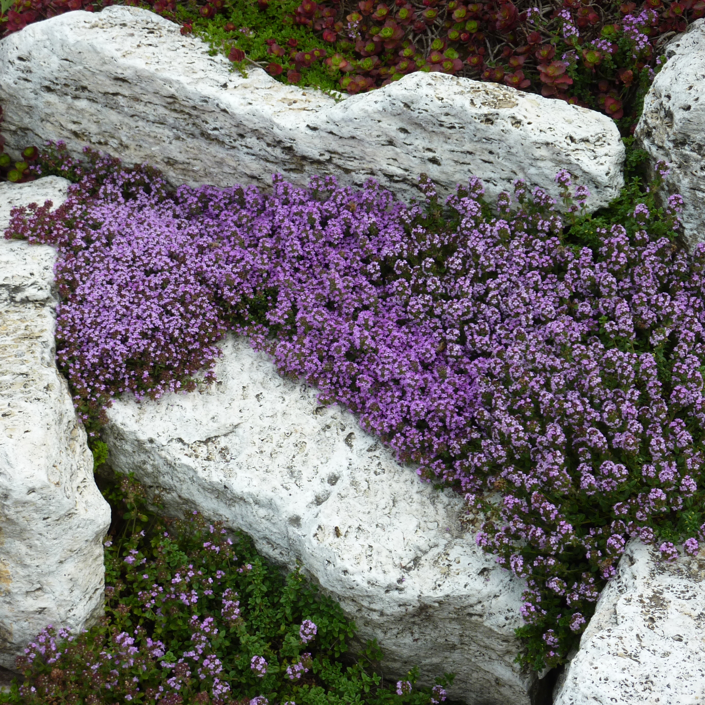 Pflanzen, die aus dem Gebirge stammen, sind häufig nicht nur karge Böden und Trockenheit gewohnt, sondern auch direkte Sonneneinstrahlung. Daher sind viele in der Gärtnerei als Steingartenpflanzen erhältliche Arten ideal für Mauern in praller Sonne. Die Grasnelke bildet zum Beispiel eine lange Pfahlwurzel und ist dadurch standsicher und trockenheitstolerant. Sonnenliebend ist auch die Teppich-Glockenblume, die grüne Polster mit hübschen violetten Blüten bildet. Ihre langen Wurzeln wachsen in die Zwischenräume der Mauersteine und finden dort Wasser und Nährstoffe. Auch für Mauerkronen sind sie gut geeignet. Bekannt und beliebt für sonnige Lagen sind auch Mauerpfeffer, Steinkraut und die zahllosen Arten und Sorten der Hauswurz. Auch Schleifenkraut kommt gut mit sommerlicher Trockenheit zurecht. Gleiches gilt für mediterrane Kräuter und Duftpflanzen wie Rosmarin, Thymian, Lavendel und Salbei. Auf der Mauerkrone gepflanzt, bildet zum Beispiel der Sand-Thymian einen duftenden Teppich. Schnell füllt er auch Spalten und Mauerritzen.