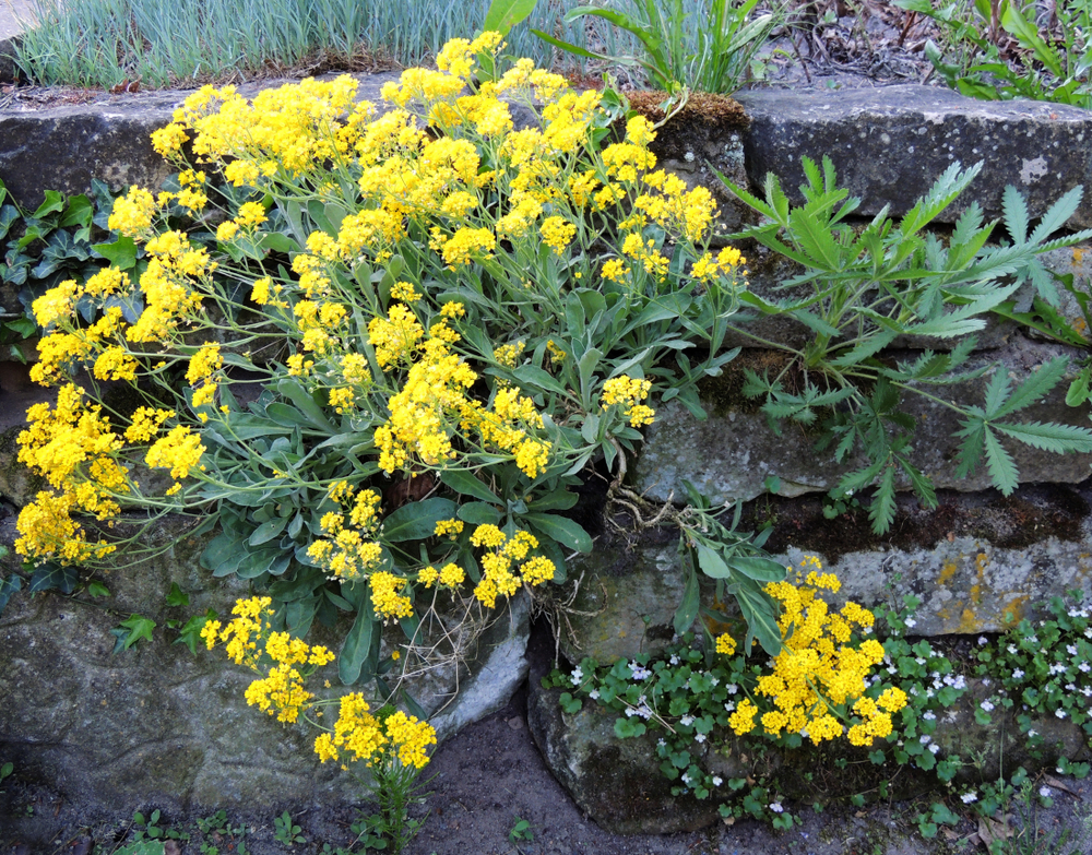 Die Kaukasische Gänsekresse stammt ursprünglich aus Bergregionen in Südeuropa. Sie bildet dichte Polster und blüht häufig schon ab Ende März. Dass Zimbelkraut perfekt für Steinmauern ist, verrät schon sein lateinischer Name Cymbalaria muralis – muralis für Mauer. Im Deutschen ist die Pflanze mit den rötlichen Stängeln und hellvioletten Blüten als Mauerblümchen bekannt. Auch sie stammt aus dem Mittelmeerraum und fühlt sich in Mauerspalten und -ritzen wohl, und das bevorzugt an halbschattigen bis schattigen Standorten im Garten.