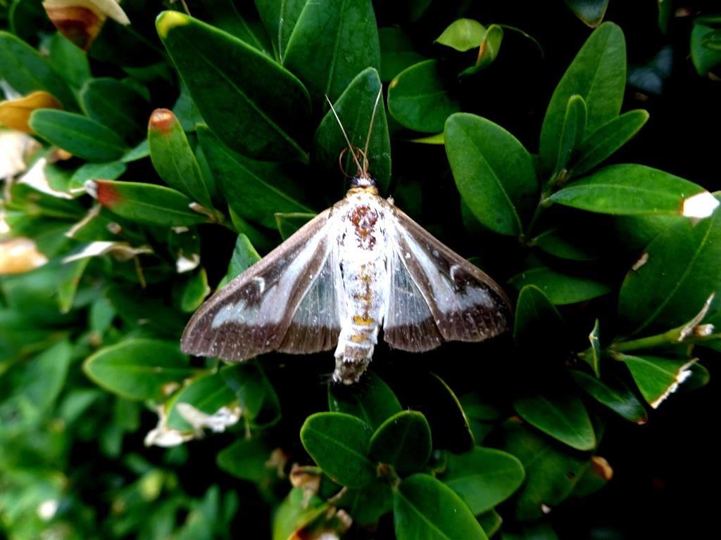 Der Buchsbaum war früher ein Gehölz, das kaum von Krankheiten und Schädlingen heimgesucht wurde. Die Schäden, die der Buchsbaumblattfloh als bisher häufigster Schädling verursacht hatte, beeinflussten den Schmuckwert nur kaum. Die Buchsbaumgallmücke trat nur örtlich und in geringem Maße in Erscheinung. In den letzten Jahren hat sich das Bild aber gewendet. Buchsbäume werden zunehmend häufiger von Spinnmilben befallen, und zu allem Unglück ist seit 2007 der Buchsbaumzünsler bei uns eingeschleppt worden, der sich systematisch verbreitet hat. Neben dem vor einiger Zeit verstärkt aufgetretenen Buchsbaumsterben führt auch dieser Schädling zu verheerenden Schäden durch Kahlfraß.Der Buchsbaumzünsler Cydalima (Diaphania) perspectalis ist in Asien, so beispielsweise in China, Korea, Japan und Indien, beheimatet. Der nachtaktive Kleinschmetterling ist weiß gefärbt und hat einen bräunlichen Flügelrand und Saum. Auf den Vorderflügeln hat der braune Rand eine kleine Ausbuchtung mit einem weißen Fleck. Es treten auch Falter mit völlig braunen Flügeln auf. Auch sie haben den weißen Fleck auf den Vorderflügeln. Die Flügelspannweite beträgt zwischen 4 und 4,5 Zentimetern. Die Schmetterlinge sind tagsüber auf benachbarten Pflanzen der Buchsbäume zu finden. Hier sitzen sie an den Unterseiten der Blätter und Nadeln, beispielsweise von Stauden oder von Thujahecken. In der Abenddämmerung werden dann während der etwa einwöchigen Lebensdauer der Falter von den Weibchen gezielt Buchsbäume zur Eiablage aufgesucht. Sie legen ihre Eier auf den Blattunterseiten ab.
