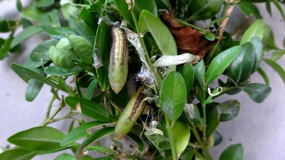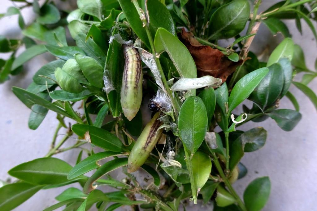 Die Junglarven sind hellgelb gefärbt, haben eine schwarze Kopfkapsel und beginnen sofort mit einem Schabefraß an den Blättern. Dadurch nehmen die Blattreste eine beige Farbe an und sind vertrocknet. Die Larven bilden etwa sechs Stadien aus und sind dann gelbgrün bis dunkelgrün gefärbt mit schwarzen und weißen Längsstreifen, schwarzen Punkten, einer schwarzen Kopfkapsel und weißen Borsten. Erwachsen werden sie etwa 5 Zentimeter lang. Je nach klimatischen Verhältnissen ist jährlich mit zwei bis drei Generationen zu rechnen. Im vergangenen heißen Sommer hatte es den Anschein, dass sich die einzelnen Generationen durch Nachzügler überlagert haben, denn bei Kontrollen an befallenen Gehölzen konnten sowohl junge als auch alte Raupenstadien gefunden werden. Auf jeden Fall ist eine außerordentlich starke zweite Generation im August mit einem mehr als doppelt so starken Flughöhepunkt gegenüber der ersten Generation aufgetreten. Die Entwicklungsdauer der Larven ist abhängig von den herrschenden Temperaturen. So wird in der Literatur angegeben, dass bei 30 Grad Celsius mit etwa nur 17 Tagen zu rechnen ist, während sich die Zeit bei 15 Grad Celsius auf bis zu 84 Tage verlängern kann. Es überwintern die Larven der letzten Generation in einem Gespinst an der Pflanze.