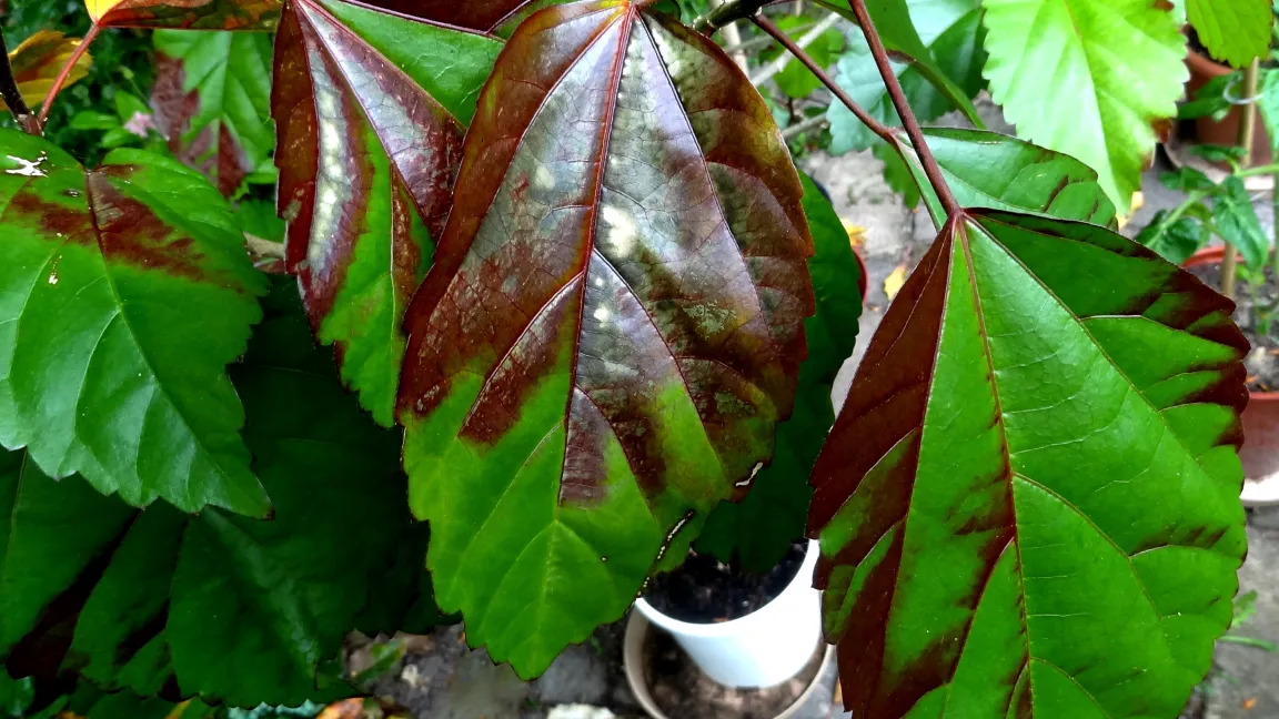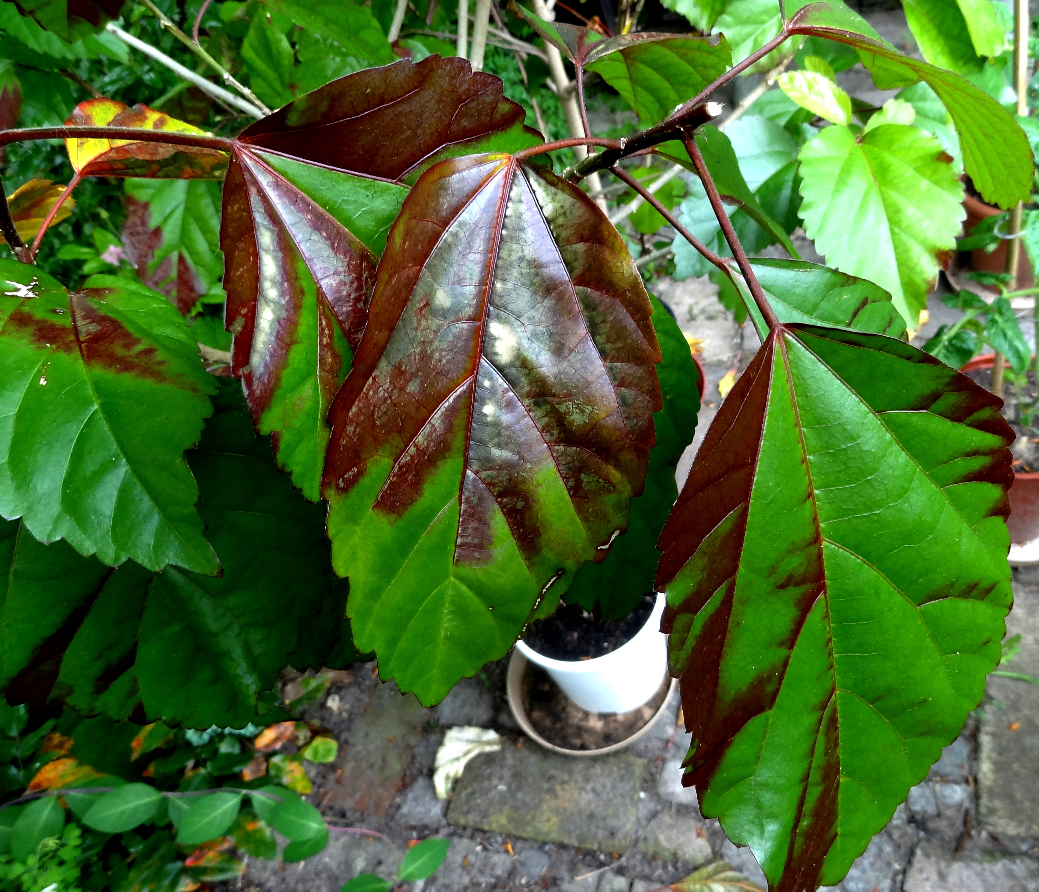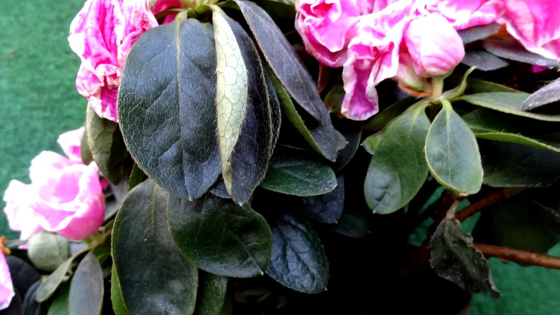 Die Blätter ändern entweder komplett oder teilweise die Farbe. Sie werden untypisch gelb, braun, rot oder andersfarbig. Das kann ganzflächig, fleckenartig, nur am Blattrand oder an der Blattspitze ausgeprägt sein. Ursachen dafür können unzureichende Wachstumsbedingungen wie Nährstoffmangel, Überdüngung und Sonnenbrand oder Krankheits- und Schädlingsbefall sein. Bei Saugschäden, zum Beispiel von Spinnmilben, Zikaden oder Blasenfüßen, zeigen sich silbrig oder schmutzig grau-grün gesprenkelte Blätter. Bei Blattfleckenkrankheiten treten unterschiedlich große, verschieden gefärbte Flecke auf, die oft andersfarbig umrandet sind. Im Zentrum der Flecke sind häufig dunkle kleine Pusteln zu finden, bei denen es sich um die Fruchtkörper des jeweiligen Pilzes handelt.