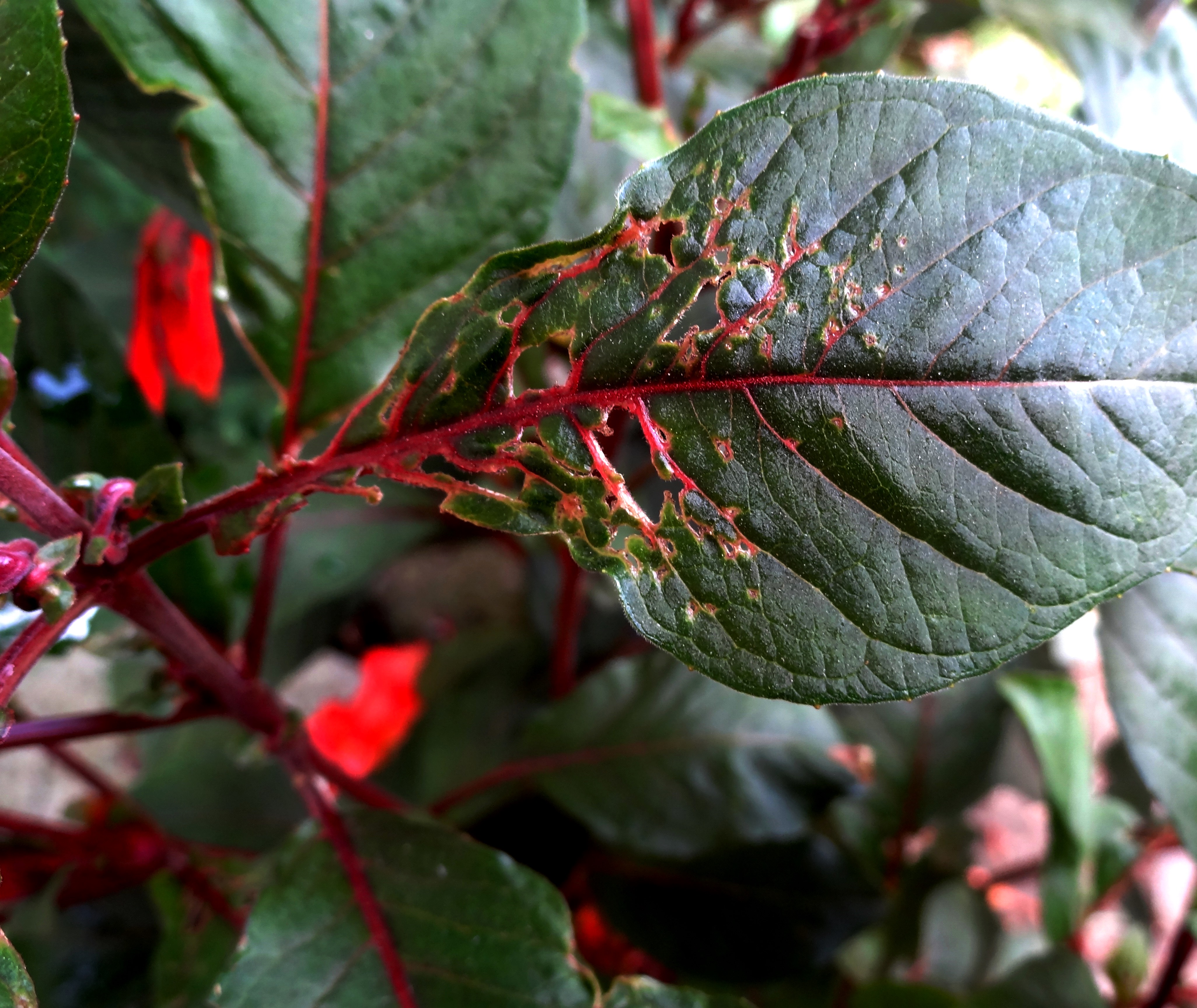 An den Blättern sind Löcher oder vom Blattrand ausgehender Fraß festzustellen. Manchmal werden auch Teile der Blattober- oder -unterseite abgeschabt. Nicht immer ist der Verursacher auf den ersten Blick zu finden, weil sich die Schädlinge tagsüber versteckt am Boden oder an den Pflanzenteilen aufhalten und erst in den Nachtstunden fressen. Das gilt beispielsweise für Raupen oder den Gefurchten Dickmaulrüssler.