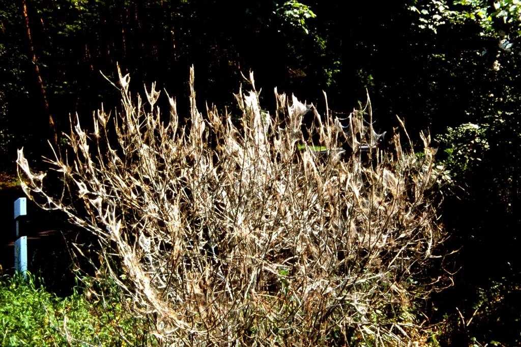 Abhilfe: Bei geringem Befall lohnt es sich, die Gespinste mit den darin sitzenden Raupen abzuschneiden und zu vernichten. Sind die Schäden umfangreich und in größeren Pflanzenbeständen, so können auch direkte Gegenmaßnahmen mit zugelassenen Insektiziden notwendig werden. Diese sind umso wirksamer, je jünger die Raupen sind und bevor größere Gespinste angelegt wurden. Um die Gespinste zu durchdringen, muss mit hohem Druck gespritzt werden.