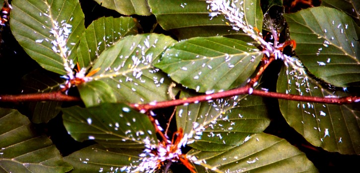 Buchenblattläuse verursachen gewellte Blätter mit nach unten gebogenen Rändern, die gelbscheckig werden und schließlich verbräunen und vertrocknen. Die etwa zwei Millimeter großen Läuse (Phyllaphis fagi) saugen an den Blattunterseiten. Sie sind an ihren bläulich-weißen wolligen Wachsausscheidungen gut zu erkennen. Ihre Saugtätigkeit lässt eine starke Verschmutzung mit Honigtau entstehen und verursacht insbesondere an Jungpflanzen erhebliche Schäden. Vom Frühjahr bis Frühsommer bringen die Buchenblattläuse mehrere Generationen hervor. Die Eier überwintern an den Knospen.
