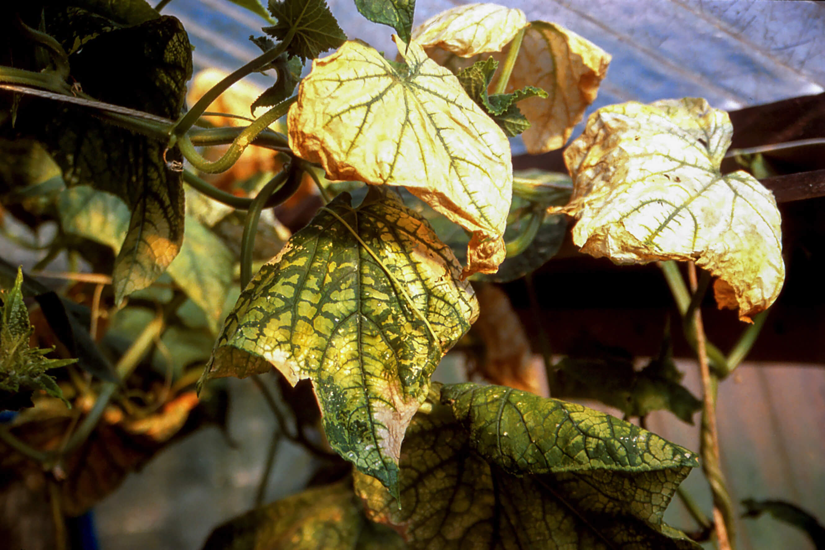 Verbrannte Blätter an Gurken im Kleingewächshaus