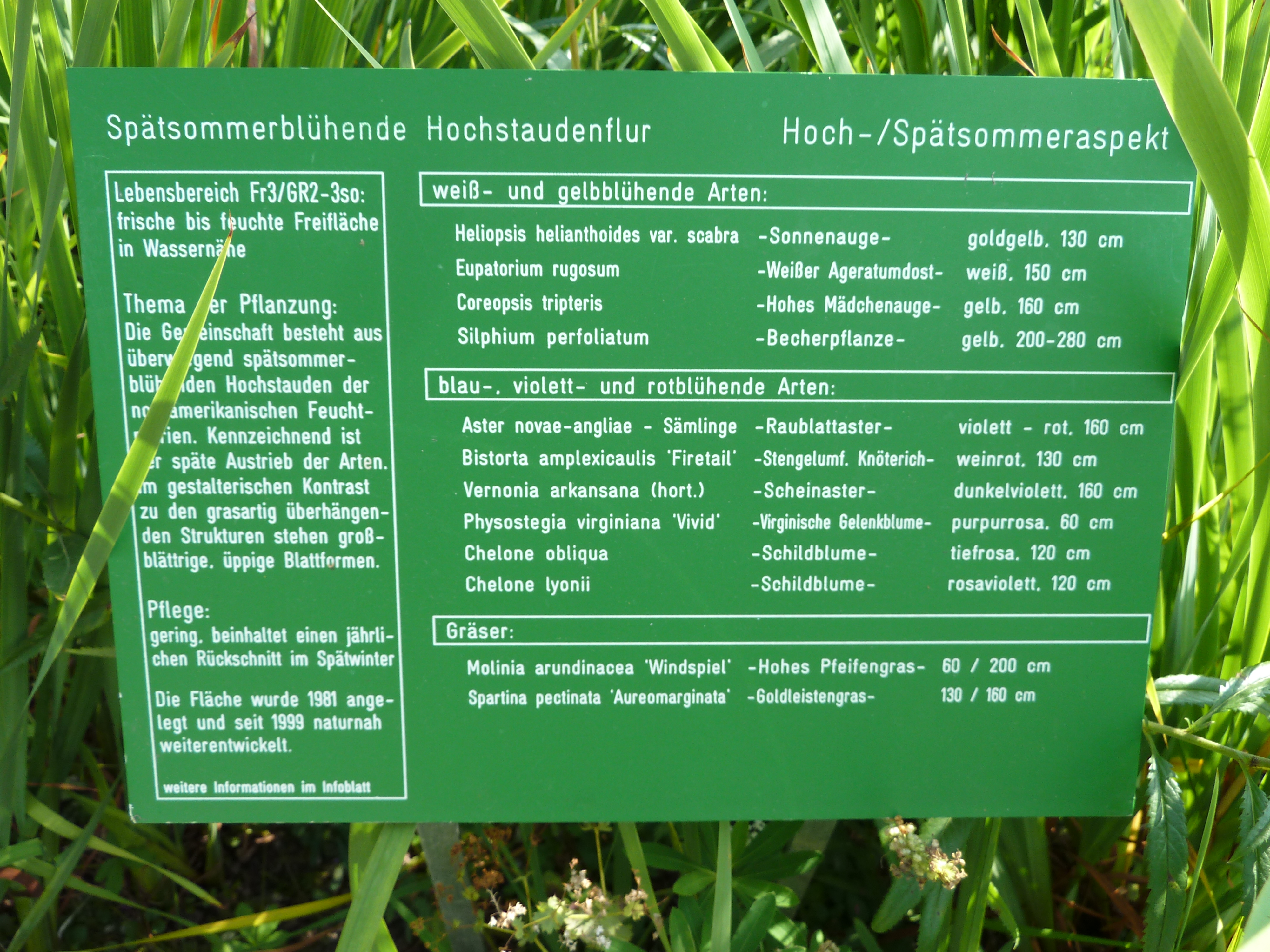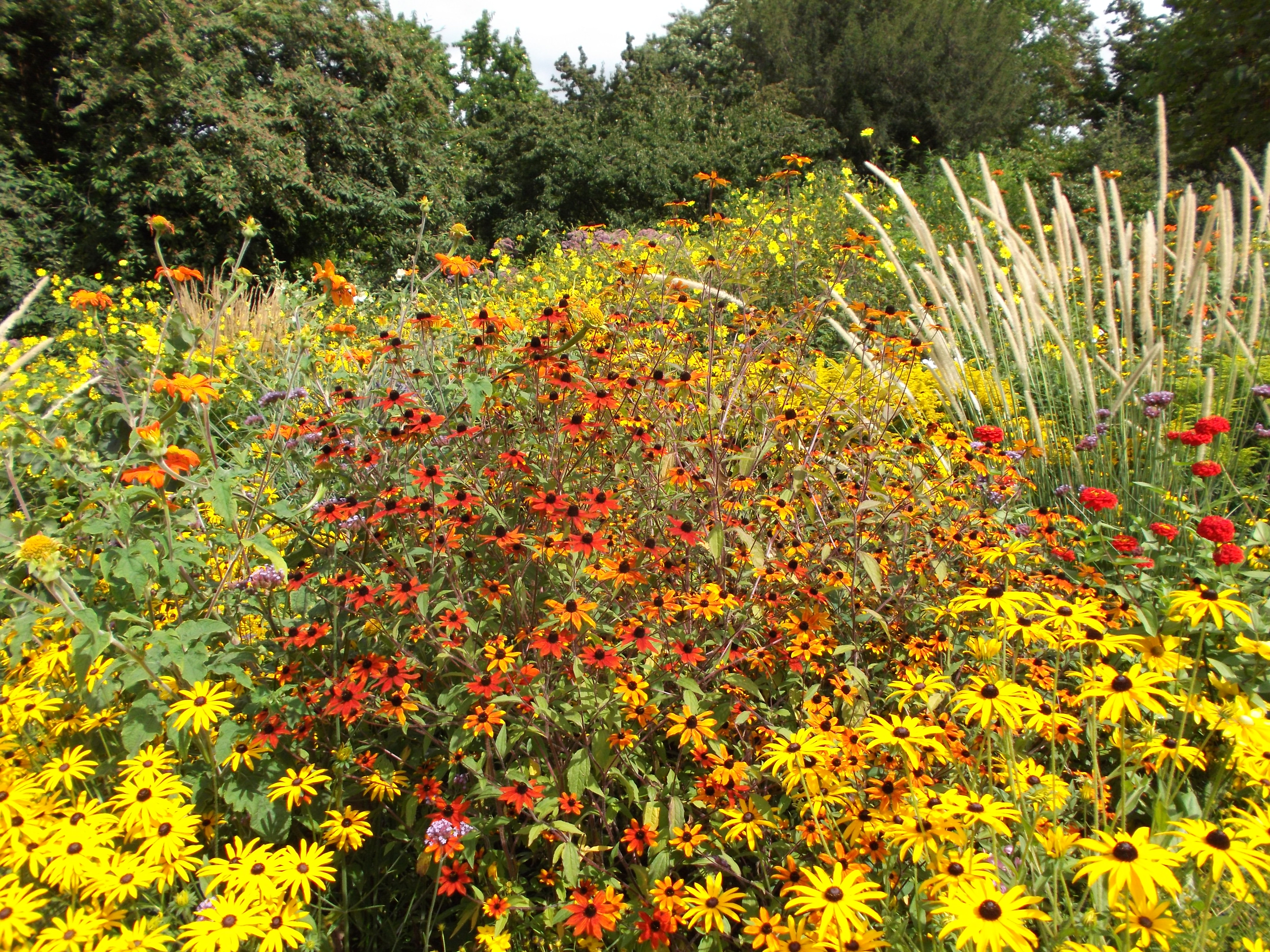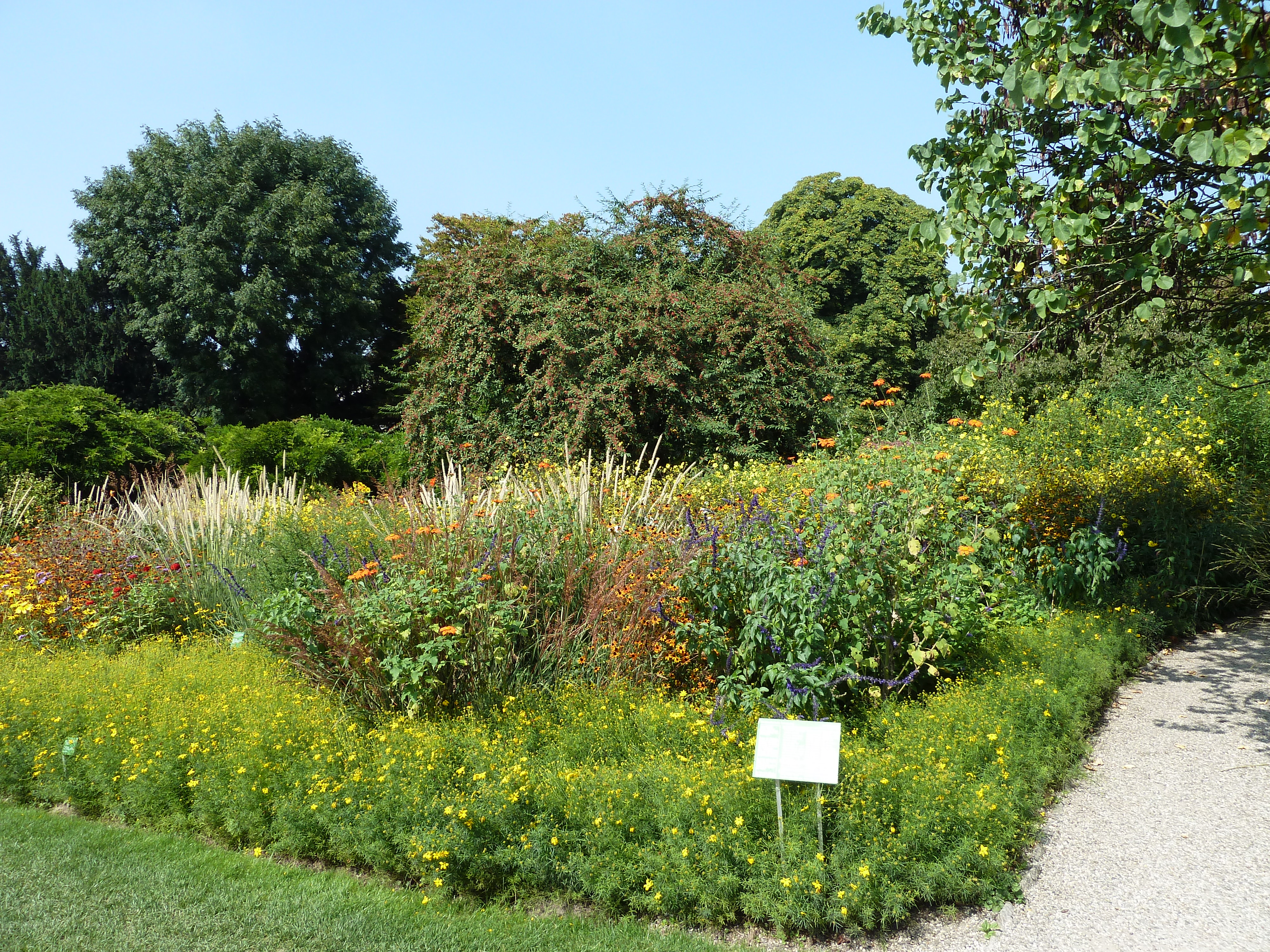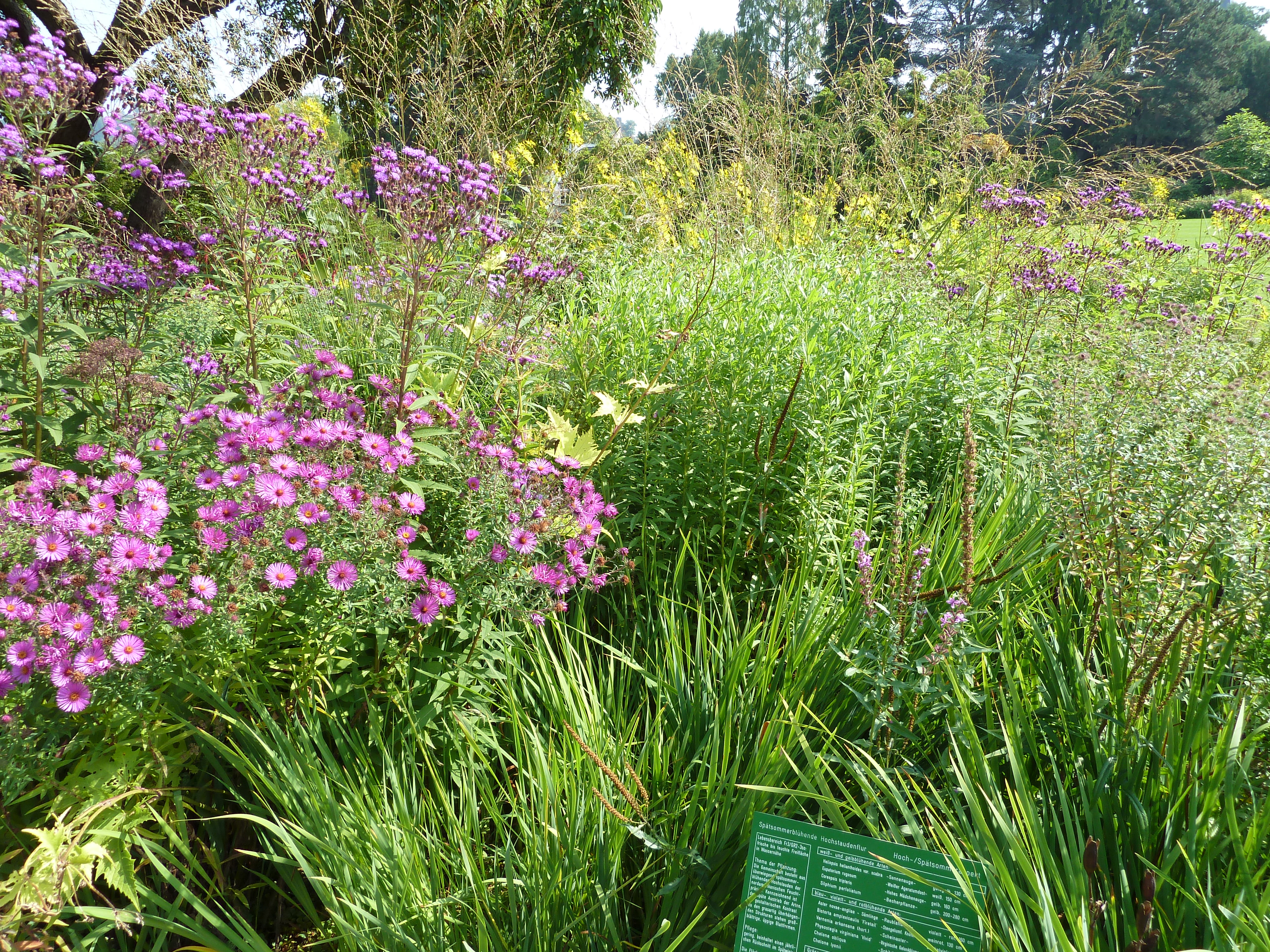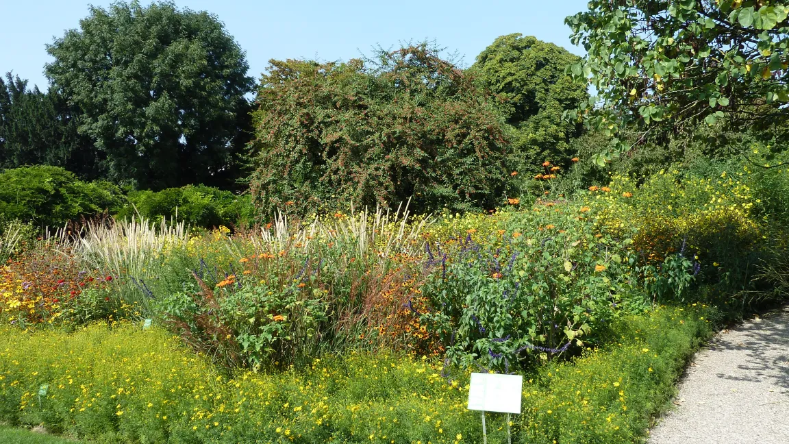 Beim Rundgang Mitte August stehen die meisten Stauden in voller Blüte – ein Farbenmeer in Gelb und Orange. Im inneren Bereich prangen die Wildstauden. Auf der Feuchtwiese wachsen Gräser und dekorative Schilfkolben. Die Gehölzränder sind europäischer und asiatischer Herkunft, und besonders farbenprächtig sind der Präriegarten und die nordamerikanischen Beetstauden vor dem Gärtnerhaus. Hier finden sich Hochsommerblüher wie Distel, mediterrane Artischocke und Kugeldistel.