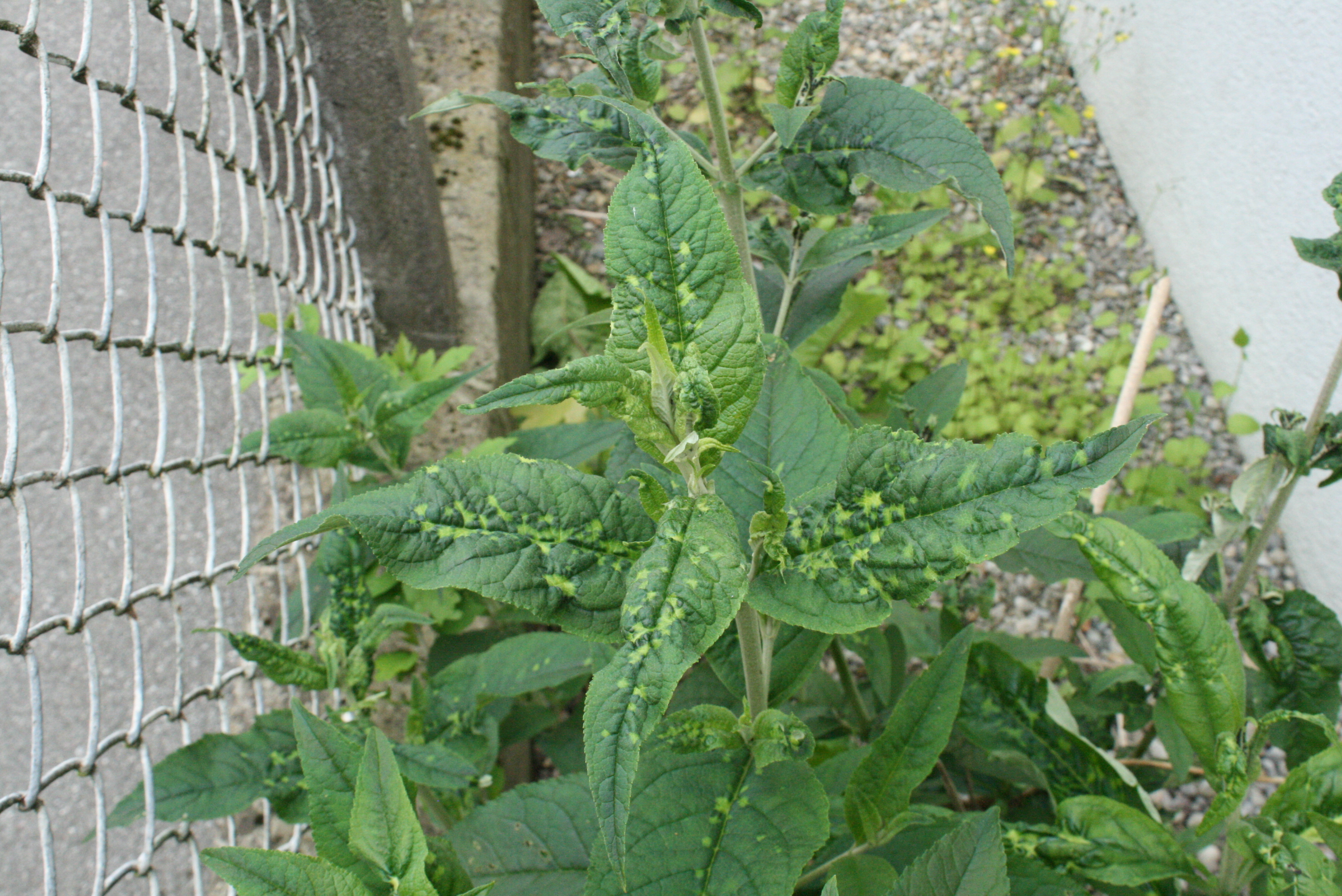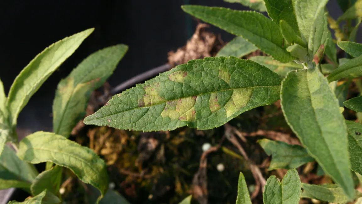 Verkrüppelte, gelbscheckige Blätter an Schmetterlingsflieder