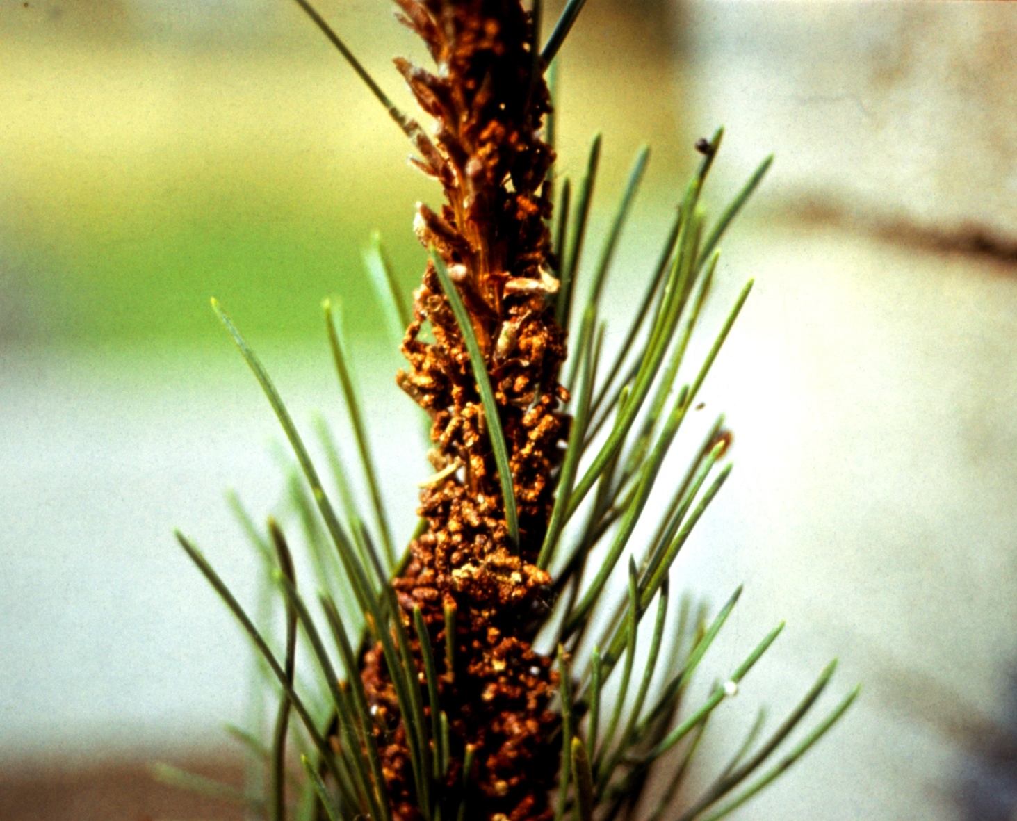 Von Gespinströhren umhüllte Triebspitzen weisen auf Befall durch die Kiefernkulturgespinstblattwespe – Acantholyda hieroglyphica hin. In den Gespinströhren leben ihre Larven. Die Röhren sind unterhalb des Knospenquirls bis zu dessen Basis zu finden. Die Larven fressen die Nadeln an Triebspitzen von Kiefern von oben nach unten weg. Sie sind etwa 2,5 Zentimeter groß, schmutzig-braungrün, bräunlich gesprenkelt und tragen eine dunkle Linie auf Bauch und Rücken. Die Gespinströhren sind außen mit Kotkrümeln bedeckt. Die Wespen fliegen im Juni. In dieser Zeit legen die Weibchen ein Ei an den Maitrieb ab. Nach kurzer Fraßtätigkeit verlassen die Larven bereits im August die Gespinströhren und ziehen weiter in den Boden. Hier verpuppen sie sich im Mai des folgenden Jahres. Der Schädling entwickelt jährlich nur eine Generation. Ein Teil der Puppen bleibt zwei oder drei Jahre liegen, bevor die Wespen schlüpfen. Das Schadbild ist zwar sehr auffällig, die Schäden sind aber vor allem bei Zierkiefern in Gärten und Grünanlagen bisher gering. Vor allem in Baumschulen können sie jedoch größer sein.