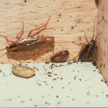 Bei uns führt die Deutsche Schabe oder Hausschabe Blattella germanica die Hitliste der schädlichen Schabenarten an. Mit 13 bis 16 Millimetern Körperlänge sind Hausschaben nur etwa so groß wie Fliegen. Sie sind hell- bis dunkelbraun gefärbt, die Weibchen meist dunkler. Die Eibehälter, Ootheken genannt, sind 6 bis 9 Millimeter lang, hellbraun und sichelförmig. Unter optimalen Bedingungen dauert die Entwicklung vom Ei bis zum geschlechtsreifen Insekt nur 40 Tage, in der Regel aber zwei bis drei Monate. Besonders wohl fühlen sich die Hausschaben bei Temperaturen von mehr als 20° Celsius. Sie verstecken sich hinter Waschbecken, Küchenschränken, Scheuerleisten, Türrahmen und in defekten Fugen und Mauerritzen. Auch hinter Wärmeaustauschern von Kühlschränken und in elektrischen Geräten werden die unangenehmen Gäste regelmäßig gefunden.