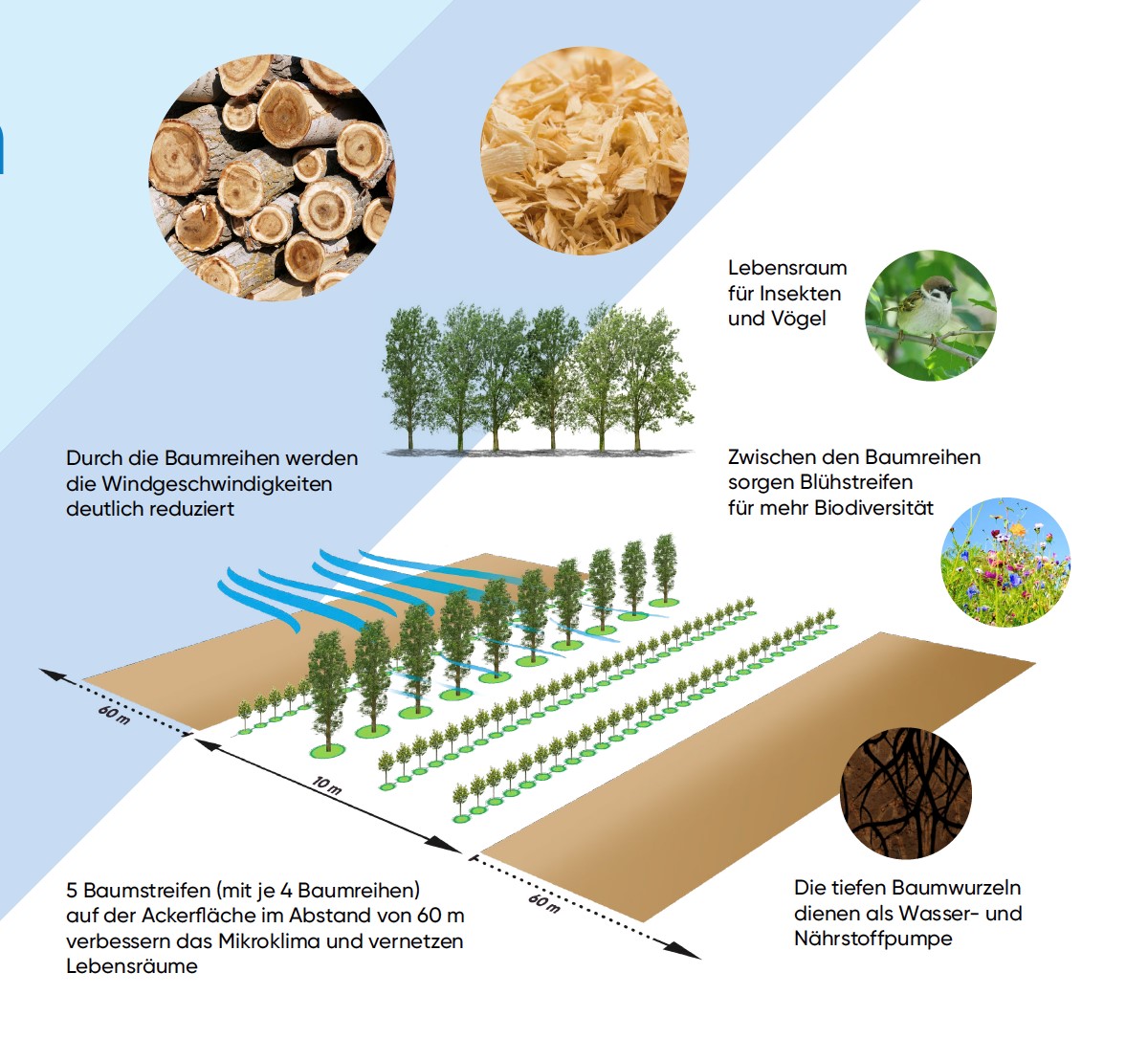 Konkret werden der Kombination von Gehölzen mit Ackerkulturen oder Grünland folgende Vorteile für Klima, Biodiversität und Wirtschaftlichkeit gutgeschrieben: