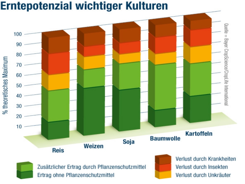 Die Schwankungen der Ernteerträge hängen vor allem vom Wetter während Aussaat, Wachstum und Ernte ab. Darauf haben Landwirte keinen Einfluss. Aber sie können durch ihr Fachwissen und geeignete Anbaumethoden das Ertragsniveau erhöhen. Ohne Mineraldünger und chemische Pflanzenschutzmittelwürde in wichtigen landwirtschaftlichen Kulturen wie Reis, Weizen, Soja, Mais und Kartoffeln etwa 40 Prozent weniger geerntet werden.